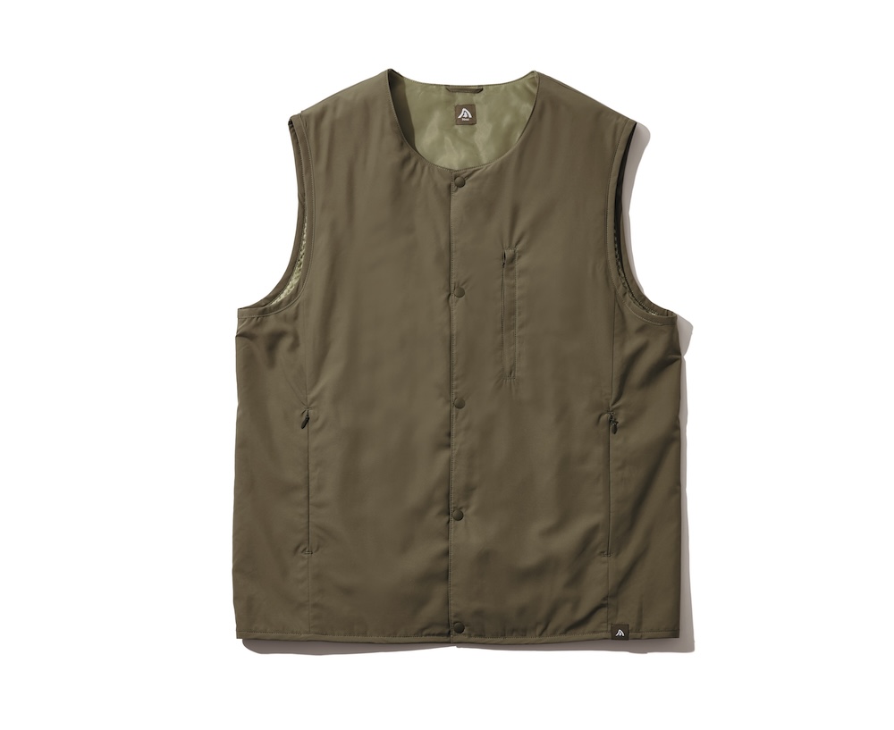部位によって中綿を変えている保温性のバランスに優れたインサレーションベスト。機能性の高い綿を身頃部分に用いて、お腹の弱いハイカーにも配慮。超軽量繊維で、畳めば掌に収まるサイズに。