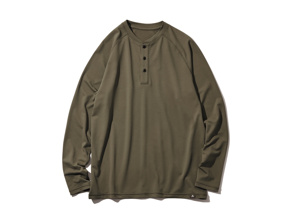 肌に触れる部分を撥水糸に、外側を吸水糸に使い分けた凹凸編み構造で、発汗時のベタつきや張り付き、汗冷えを抑えてくれるヘンリーネック。UV遮蔽率も99%で、デイリーユースにもおすすめ。