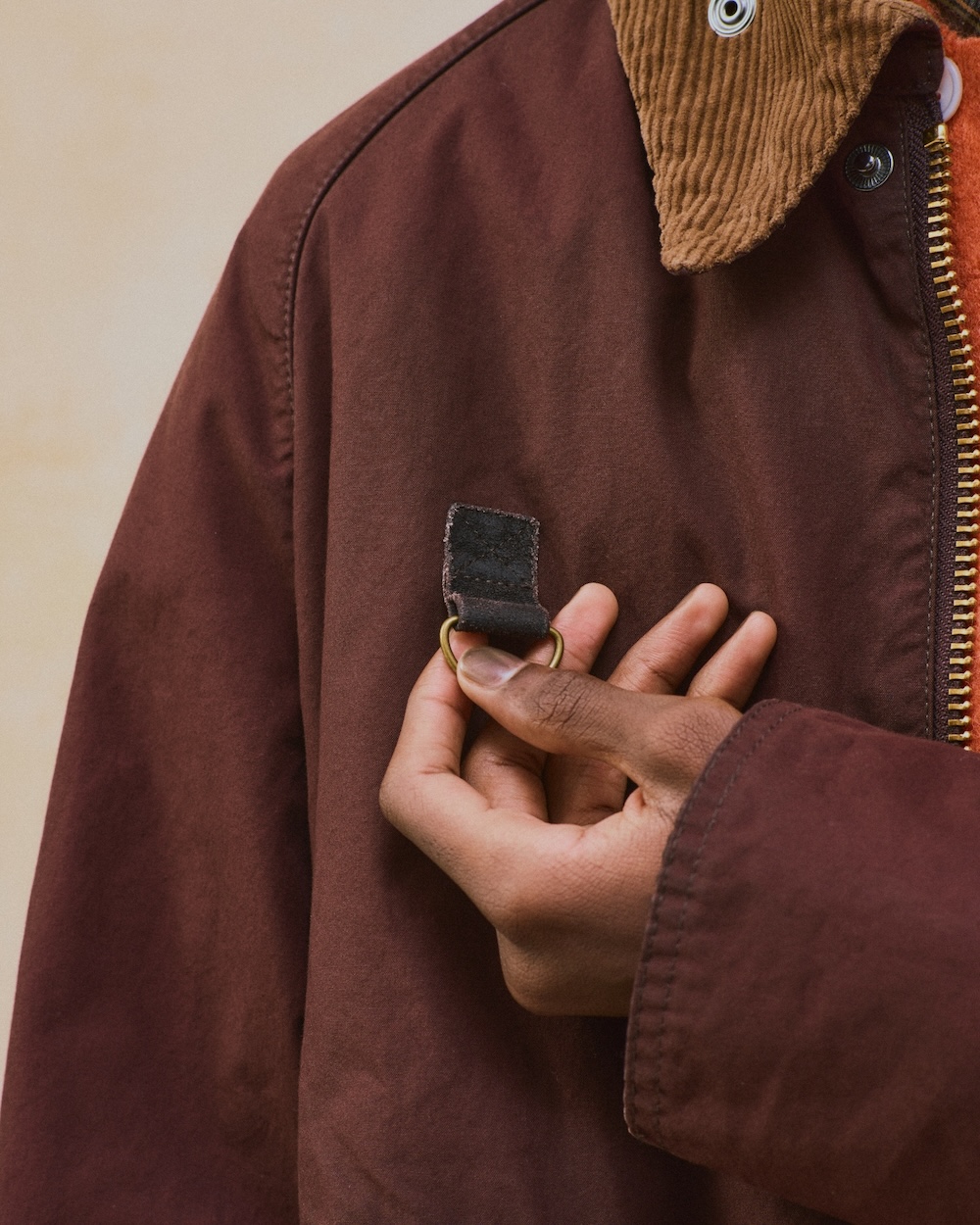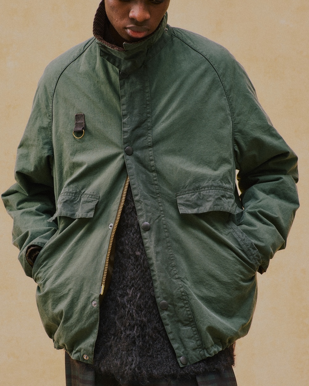 着込んでいくうちにワックスが抜けたような質感を演出するために、ワックスドコットンに洗い加工を施して、リアルに再現されています。オリジナルモデルよりも着丈を若干長くし、タウンユース向けにシフト。裾はスピンドルが採用されているので、自在にシルエットを変更することができます。