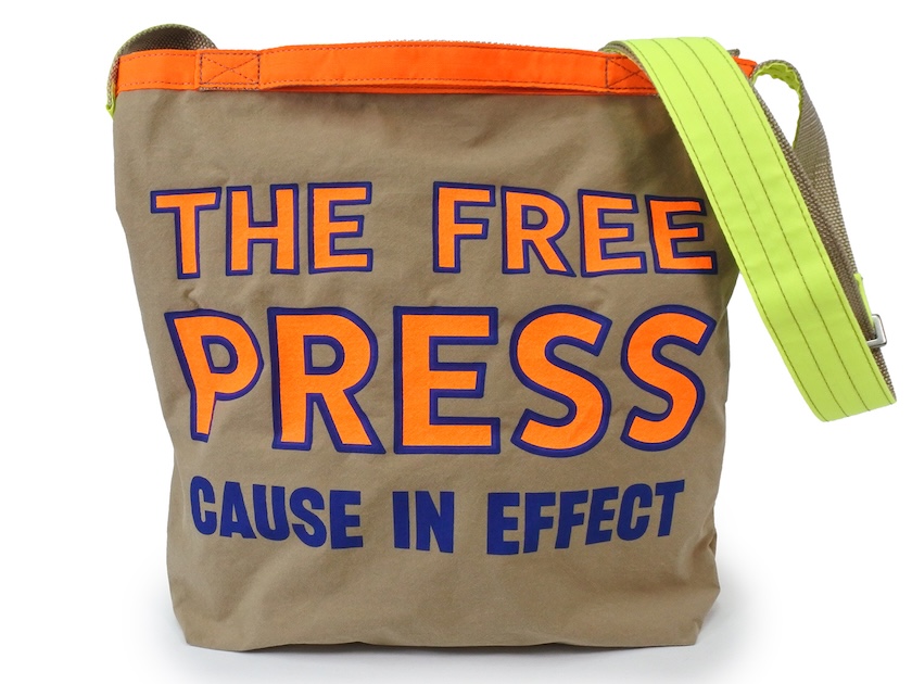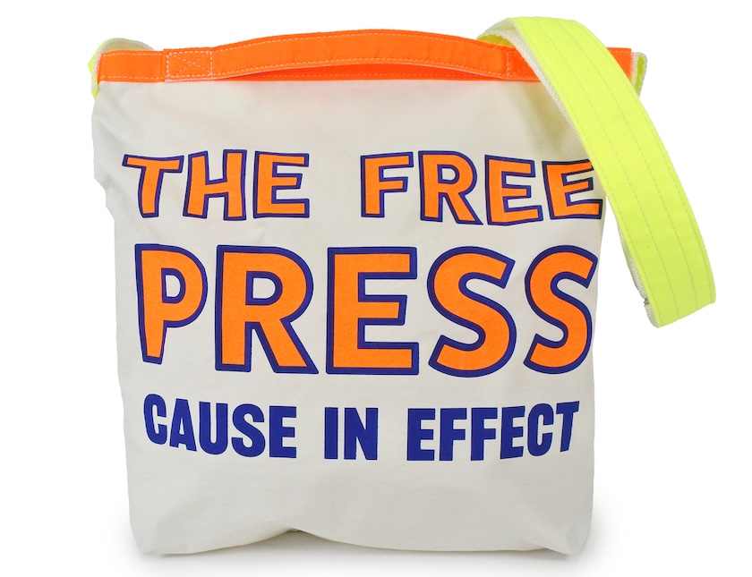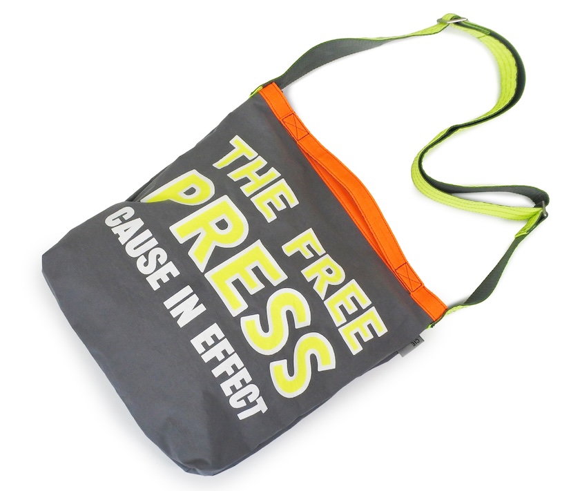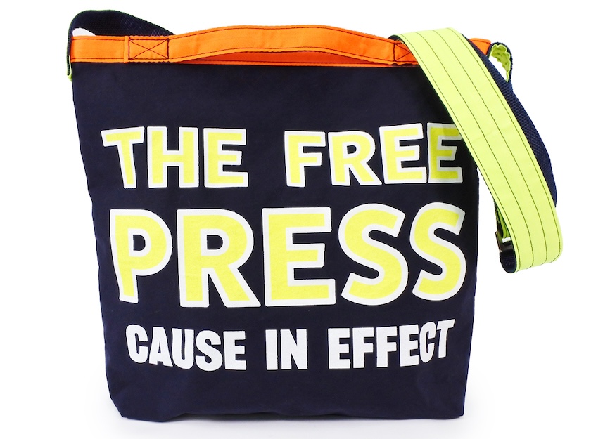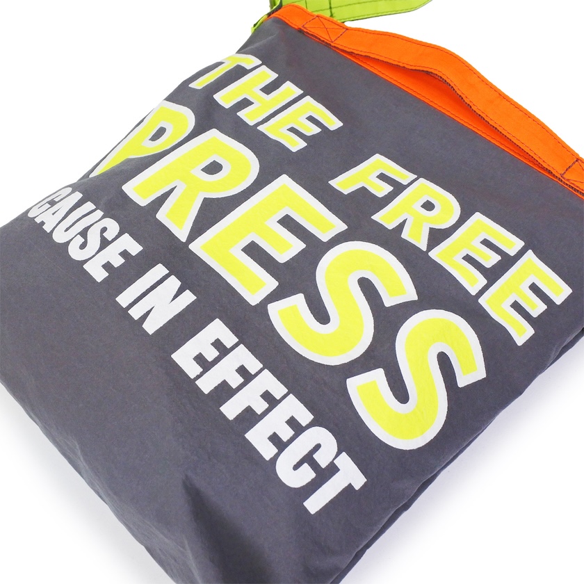 フロントのグラフィックはその当時に新聞社が報道の自由をうたって用いた文言を採用。ショルダーストラップと同様に暗闇でも存在感を放つ、ビビッドなカラーリングが落とし込まれています。