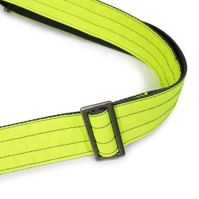 ショルダーテープは幅広で身体にフィット。4本ステッチを施すことでヘタりにくく、蛍光イエローによって視認性を高めているのも特徴です。