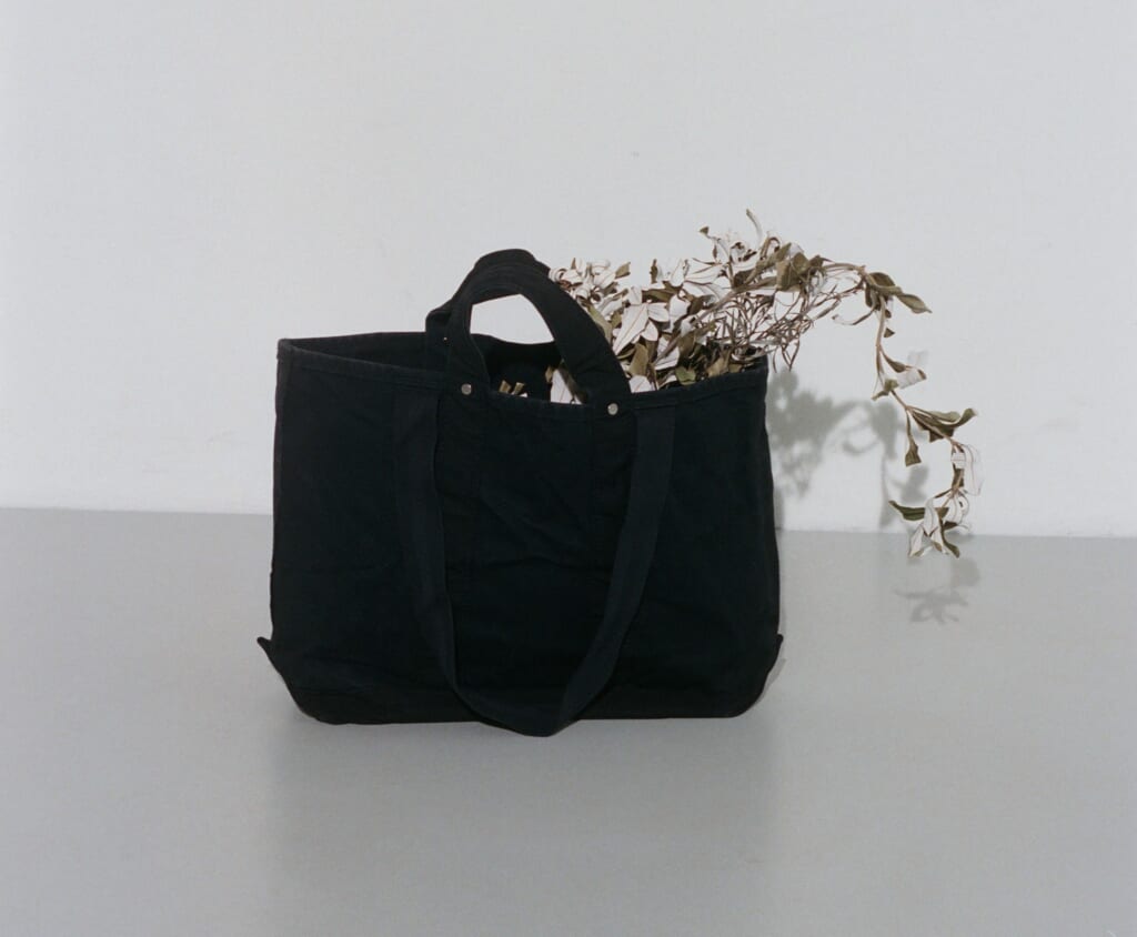 食料や雑貨などを運ぶためのマーケットトートをベースにマチを広げて PCや A4サイズの書類などが入れられるように。パラフィン加工したキャンバス生地は洗いをかけることで、経年変化したような雰囲気に仕上げ、一点一点異なる表情が異なる。長さの異なるハンドルを備え、肩掛け、手持ちの 2WAYに対応。