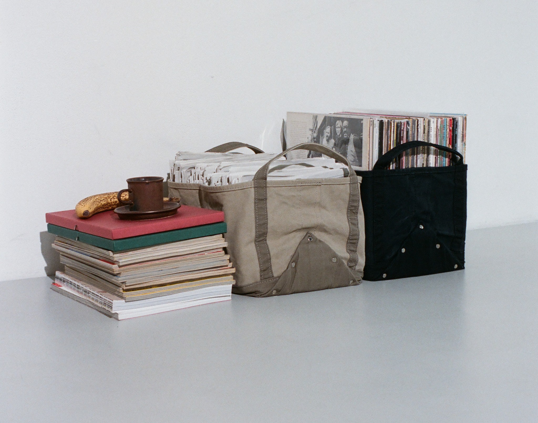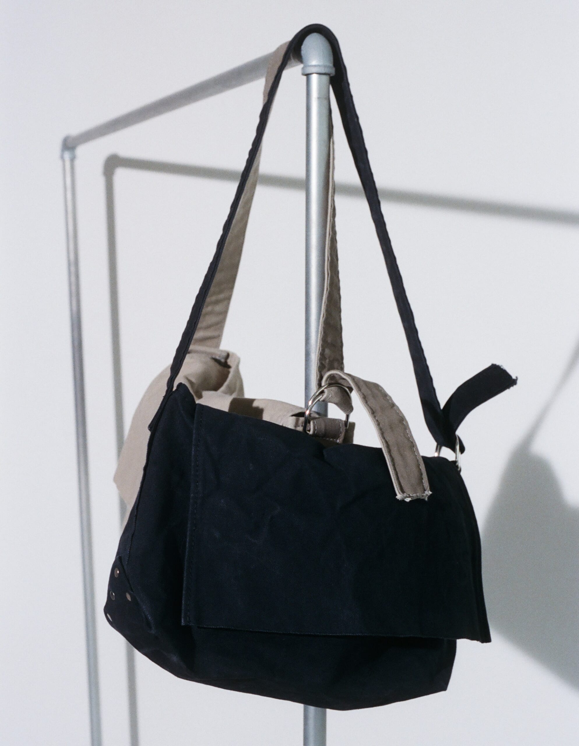 食料や雑貨などを運ぶためのマーケットトートをベースにマチを広げて PCや A4サイズの書類などが入れられるように。パラフィン加工したキャンバス生地は洗いをかけることで、経年変化したような雰囲気に仕上げ、一点一点異なる表情が異なる。長さの異なるハンドルを備え、肩掛け、手持ちの 2WAYに対応。