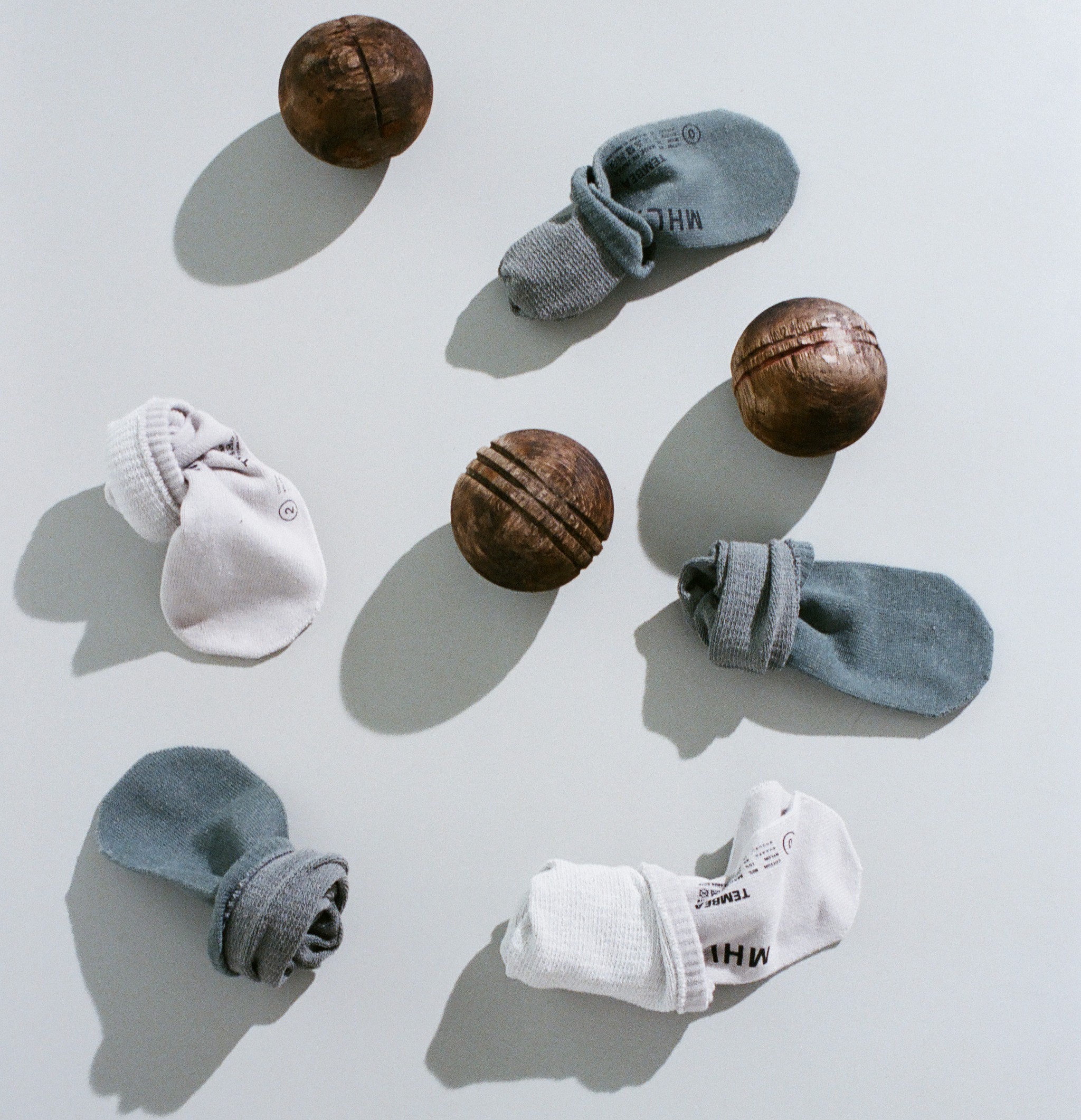 また軍手工場で生産されるソックスも淡い色調の「MHL.」オリジナルカラーで展開。シームレスなつま先の構造は指先がごわつかず、履き心地にもこだわられている。