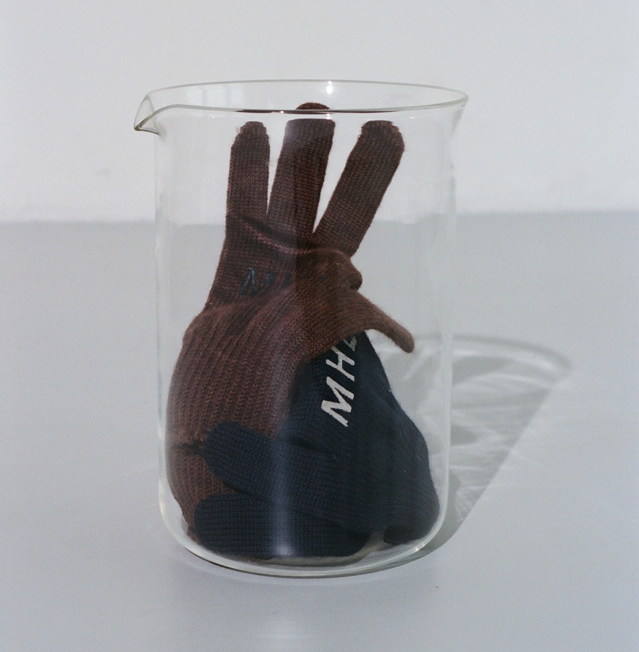 自転車をイメージしたテンベアの“CYCLE GUNTE”をメリノウールで製作。落ち着いた色味とし、作業用の軍手のように「MHL.」のロゴをさりげなくラバープリントしている。