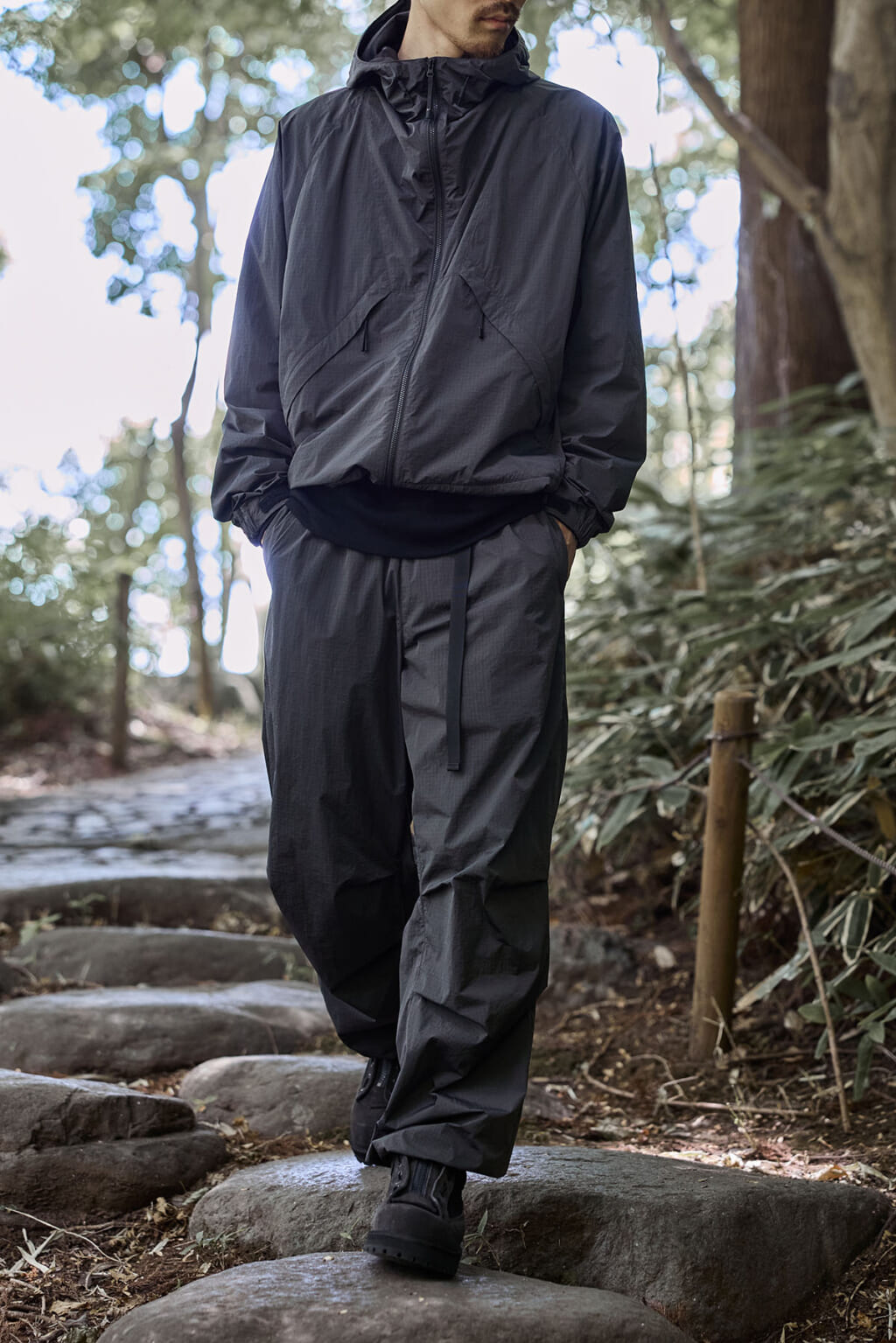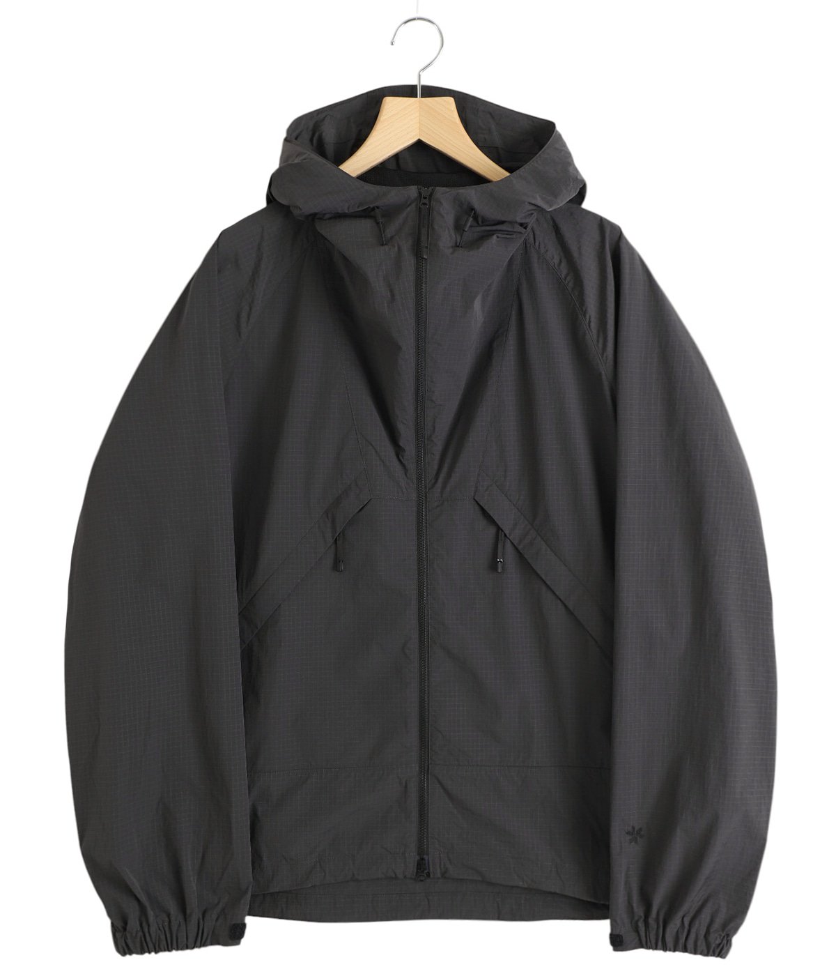 Goldwinのインラインモデル「Hooded Jacket」をベースに、従来の染色方法に比べて水の使用量や化学薬品の使用量を大幅に削減するドープダイを採用したリップストップナイロン素材を採用。都会にも自然にも溶け込むカーボングレーが、アーバンアウトドアなムードをより一層高めてくれる。
