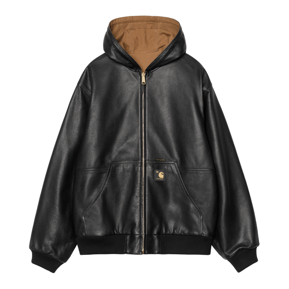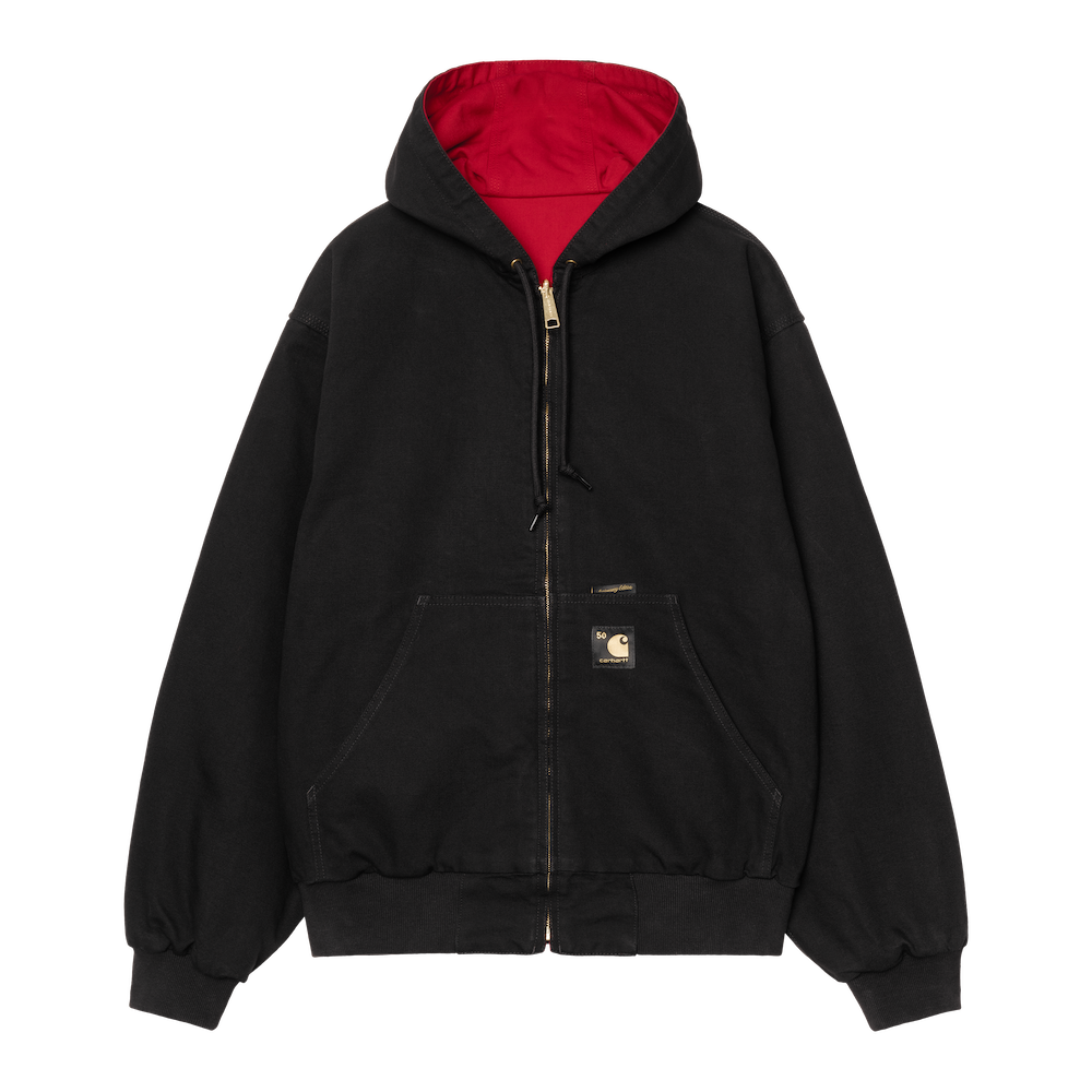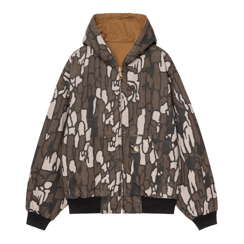「カーハート WIP」のシグネチャーであるディアボーンキャンバスには、当時のアクティブジャケットをリファレンスにした赤いリバーシブルの黒いスタイルと、カモトレバークモチーフの2スタイルがラインナップ。