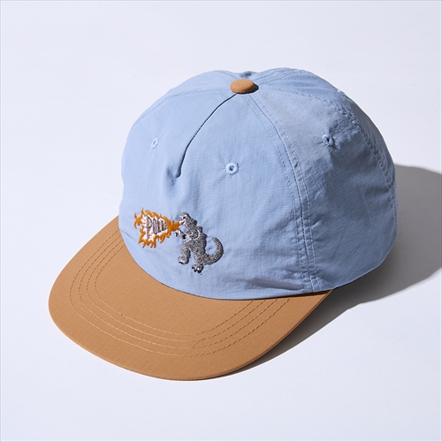 怪獣が吐いた炎の中にブランドネームをプラス。コミカルな雰囲気のグラフィックを刺繍したほか、クラウンとブリムで配色となった軽量ナイロンボディのバイカラーに。