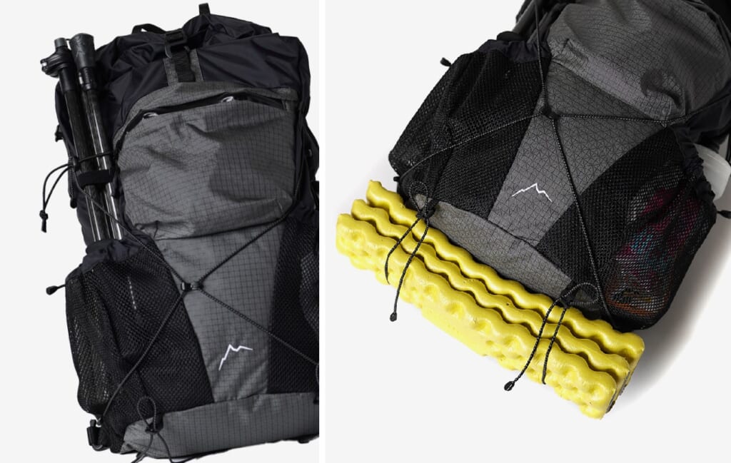フロントのファスナーポケットやサイドメッシュポケットはもちろん、上部のバンジーコードを利用してトレッキングポールやアンブレラなどの長尺物も固定できる。