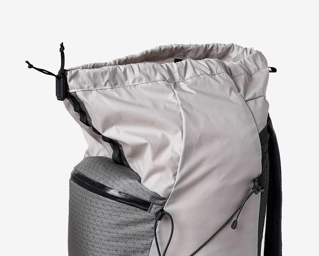 メインコンパートメントは巾着のようにドローコードでスマートに開閉でき、バックルで留めれば荷物をしっかりと固定できる。背面には脱着式のフォームパッドを内蔵し、休憩時にはクッションとしての利用もOK。厚みのあるショルダーハーネスがサポートし、重い荷物でも快適なのだ。