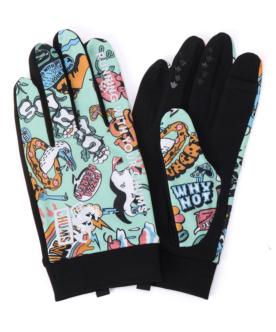 左手にはチャムスの、右手には三津家さんのオリジナルロゴを配した裏起毛のグローブは、親指と人差し指の先を出すことができる仕様で、ランニング用のアプリなどの操作を装着したままでも可能。中指と人差し指には滑り止めプリントでグリップ力を向上。マルチプリントのボディの人差し指部分には、“RUNNING WITH YOUR CHUMS”のリフレクターをプリント。