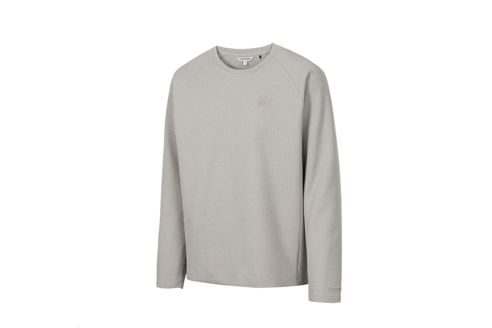 フーディータイプだけでなく、ラウンドネックのタイプも用意される。こちらの方がミドルレイヤーやアウターレイヤーと合わせやすいかもしれない。カラーとサイズの展開はフーディタイプと同様だ(記事末の画像参照)。
