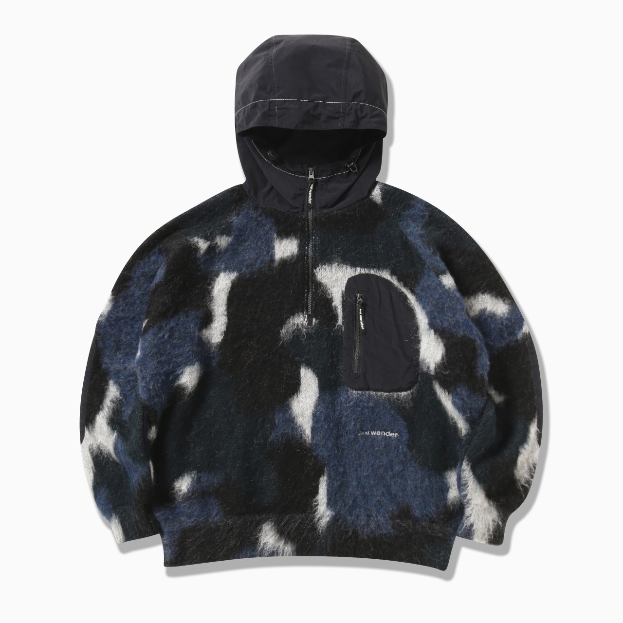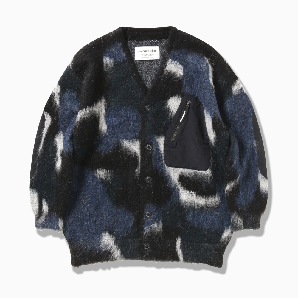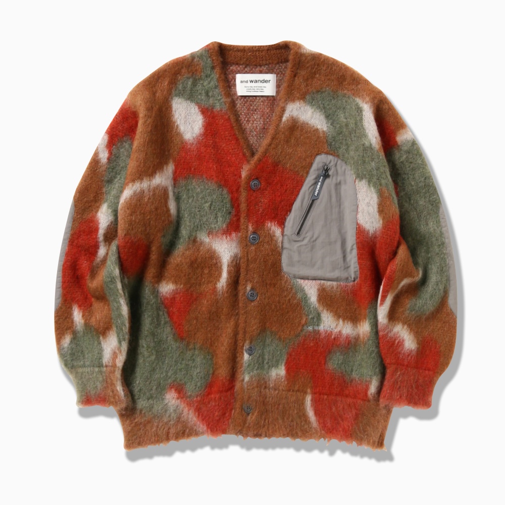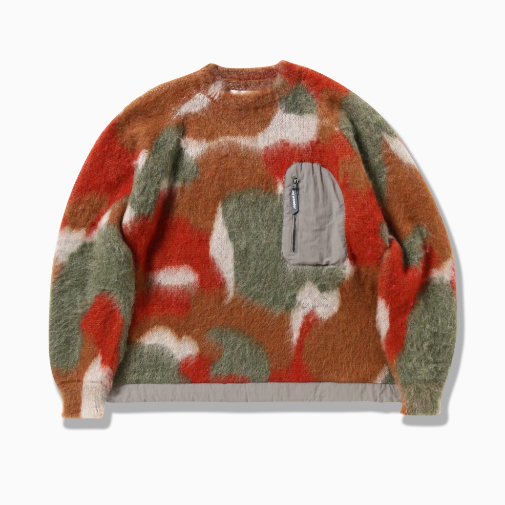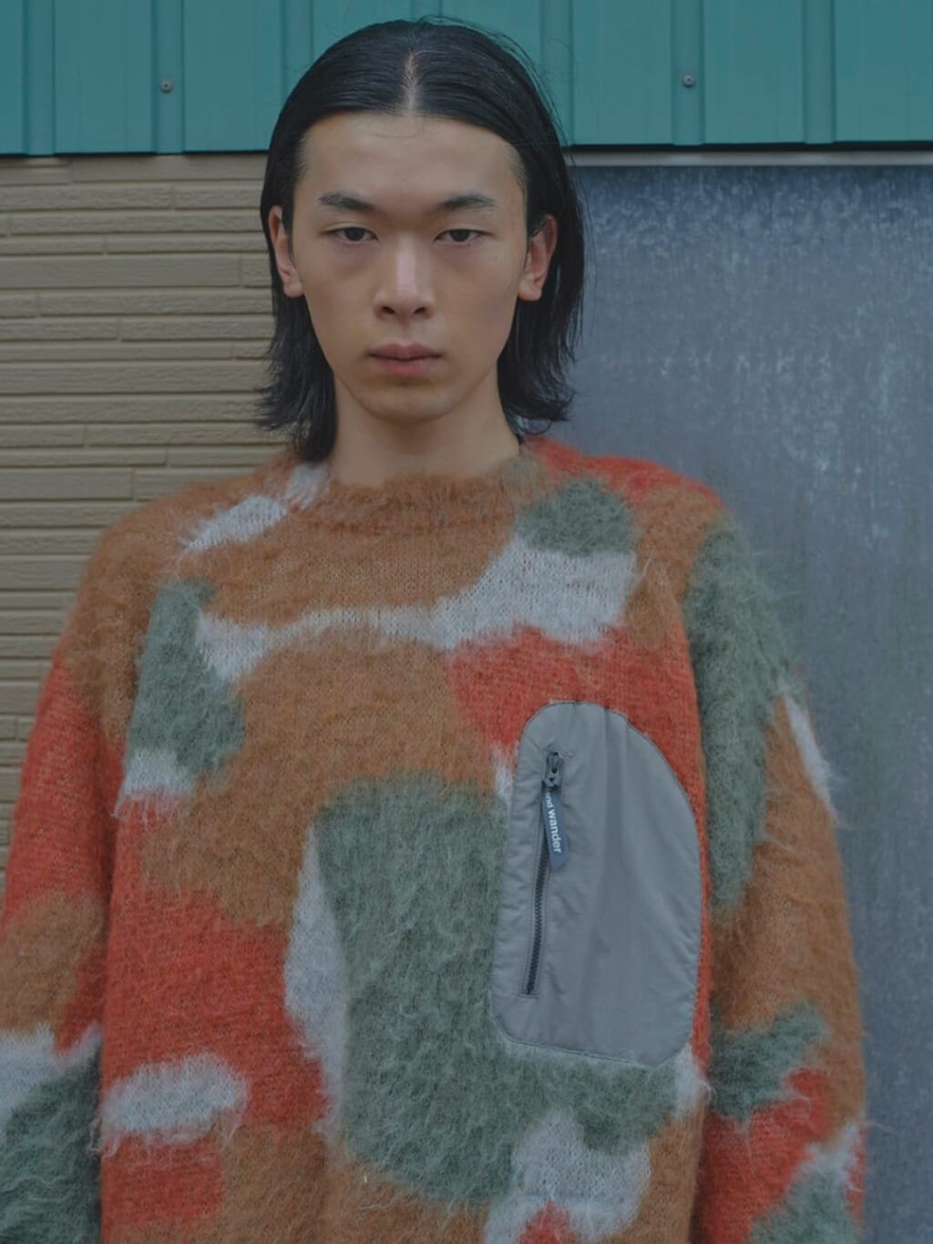 5 ゲージのダブルジャガード織を採用し、アクリル、ナイロン、ウール、モヘヤの混紡糸を、オリジナルのカモフラージュ柄で編み立てたフーディ、クルーネック、カーディガン。
