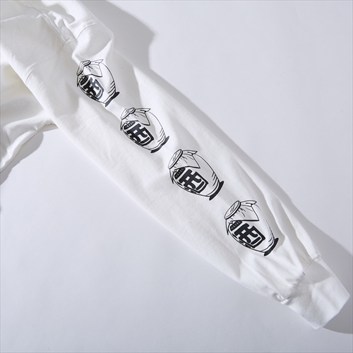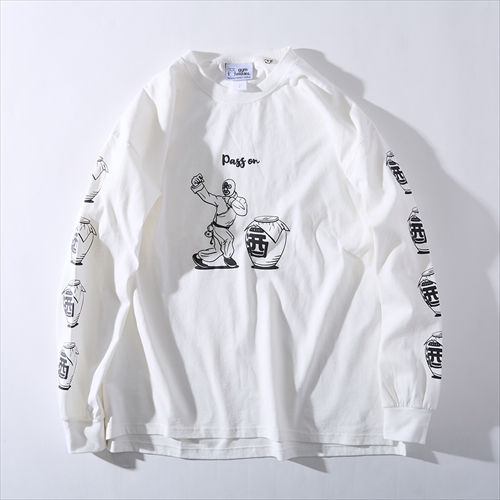酔拳に取り組む覆面レスラーにプラスして、両アームにプリントした酒瓶のモチーフも脱力感のあるユルいデザイン。ドライタッチな生地を用いたワイドなシルエット。