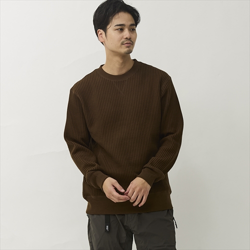 大ぶりの編み地がラフな印象を与える定番のワッフルボディを使い、首元にVガゼットを取り入れたベーシックなトップスに。どれにしようか迷う計8色のカラーバリエーション。
