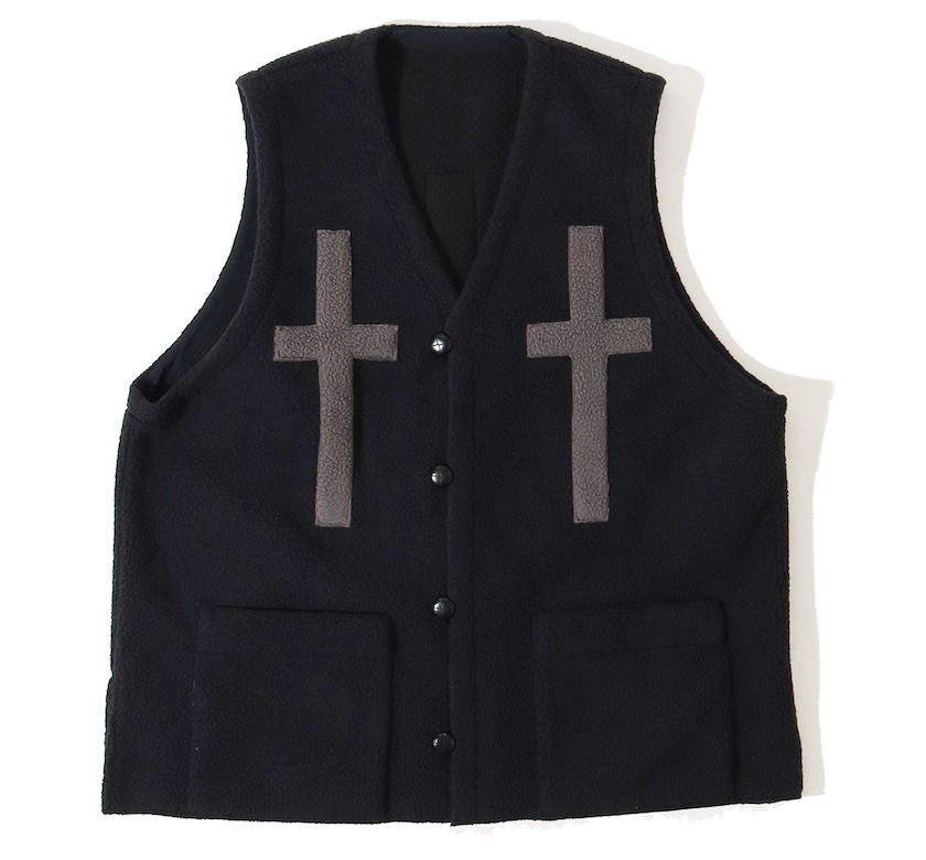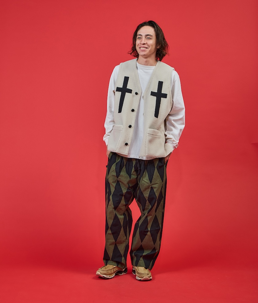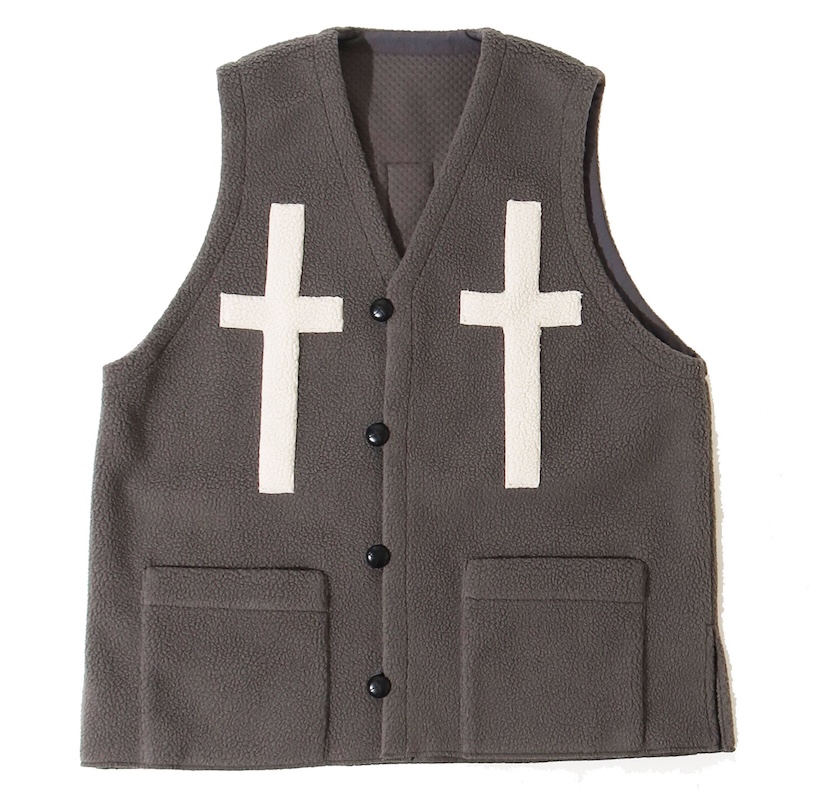 ニューメキシコ州のリオグランデ峡谷に源流を持つチマヨベストをベースに、胸元と背面にクロス柄を大胆に落とし込んだ本作。シルエットは裾をスレートに仕上げたロング仕様。