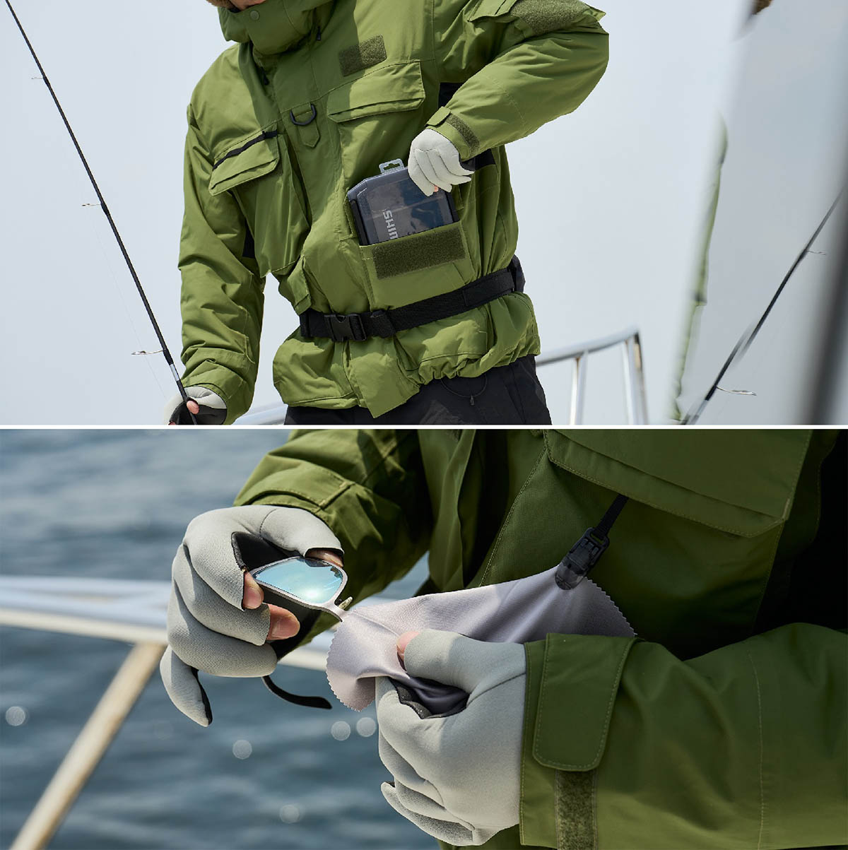 ポケット内のレンズクリーナーや各所に配されたドローコードなど、釣りやフィールド、日常生活にまで役立つ機能が満載だ。