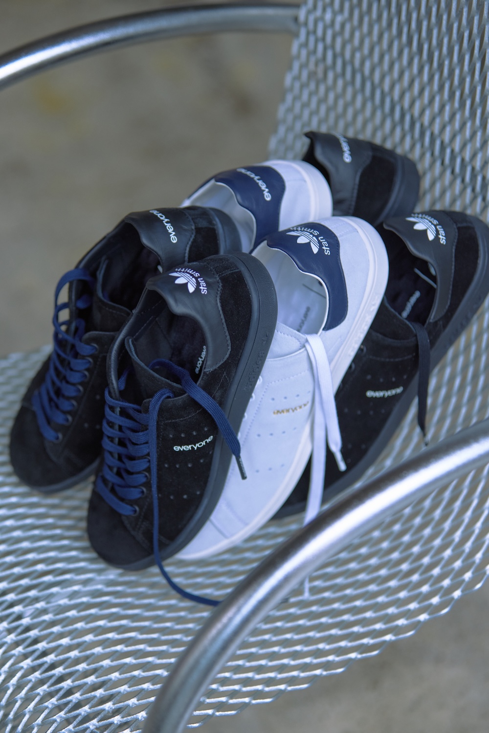 本コレクションの中核を担うのは、クラシックアイコンとして支持される“STAN SMITH”。高品質で撥水性のあるイタリアンレザーの牛スエードをメインに使用し、アッパーとヒールに部分に別注の証として、「エブリワン」のロゴが刻印されています。
