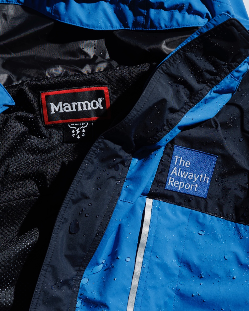耐久撥水性・透湿性・防風性に優れた耐水圧20,000㎜, 透湿15,000gの3レイヤー素材「SAITOS®」を採用した本作。左胸にはThe Alwayth Reportロゴを刺しゅう。
