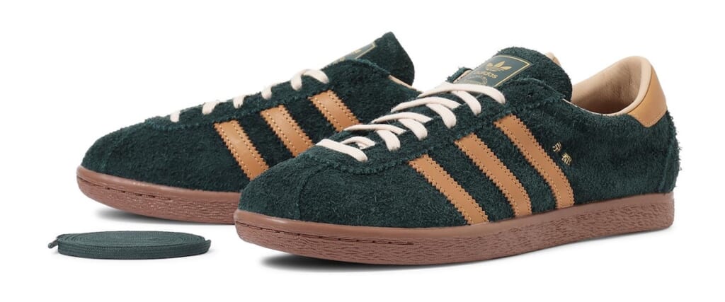 旬スニーカーの1つであるタバコに、モデル名の“京都”をプリント。「BILLY’S」Ver. は抹茶の深い緑と茶室の庭に広がる苔がモチーフの落ち着いたボディカラーで同地を表現した。スリーストライプ&ヒールには、茶筅や町屋に並ぶ竹を彷彿とさせるベージュをオン。