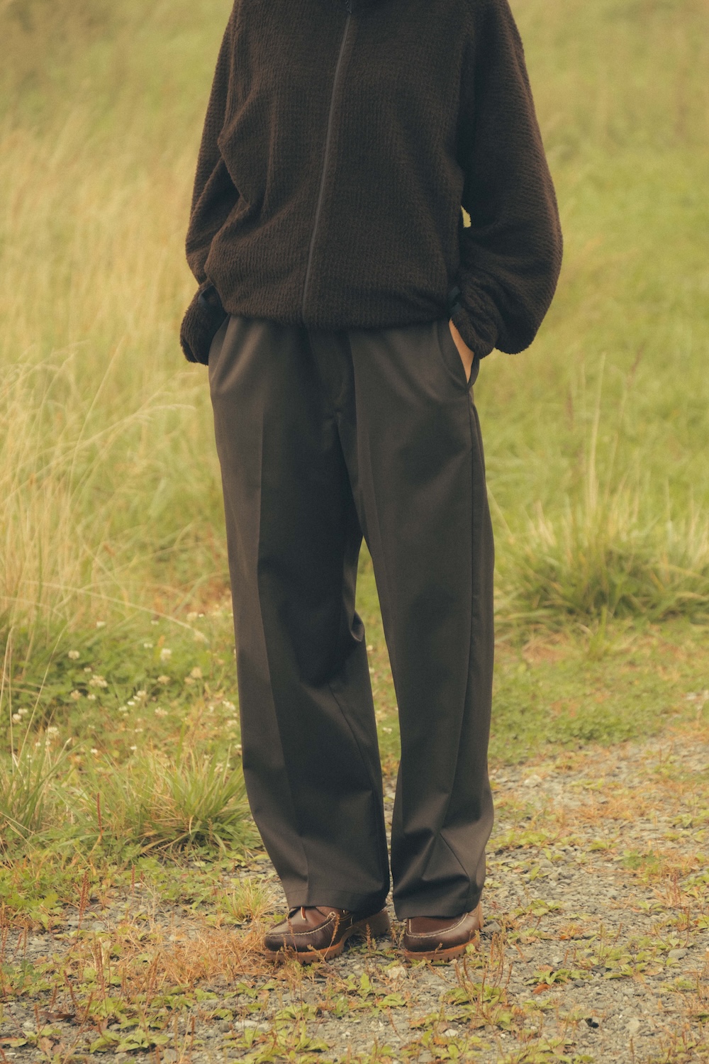 本来は耐久性に優れたコットン生地で製作されていますが、別注モデルはメリノウールとREPREVEというリサイクルポリエステルを混紡。ウール特有のしなやかさとドライでソフトな肌触りが特徴的で、スラックス感覚で穿ける仕上がりに。