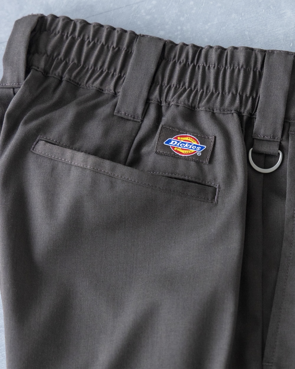 また、ウエストの後ろ部分はゴムを入れたスピンドルを配置し、フロントのトップとヒップポケットはスナップボタンに、さらにベルトループには Dカンを採用。こういったディテールが実用性もあって、いいんですよね。