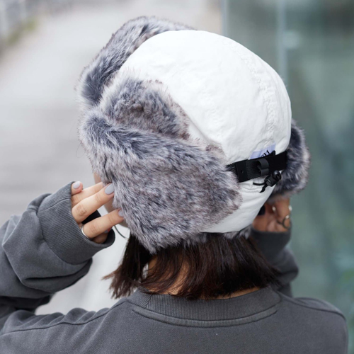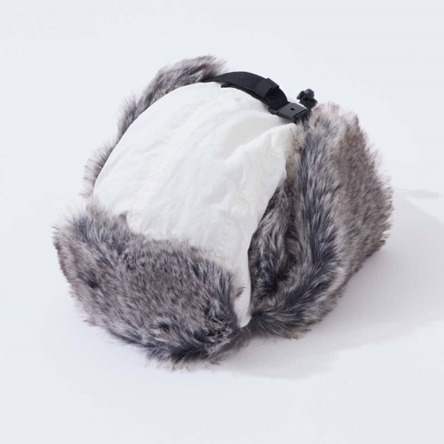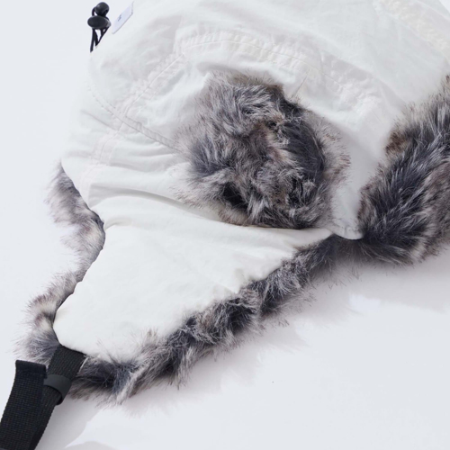 毛足が長いファーの耳当てが上げ下げできるアビエイターキャップ。バックパネルのドローコードを絞ると、フィット感が自在に調整できるユニセックスな一品。