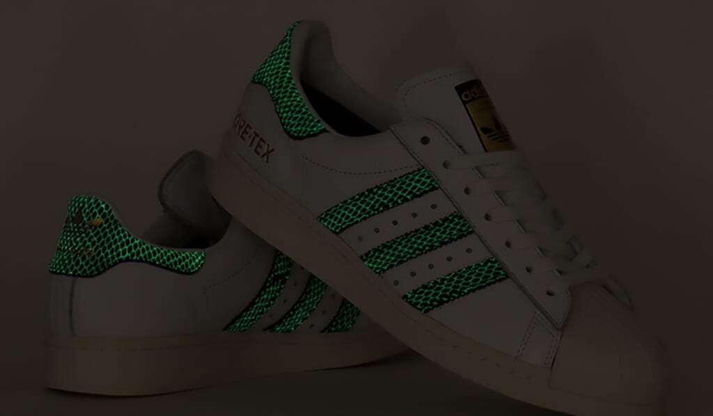 名作“スーパースター”の中でも完成度が高いとされる‘82年製がモチーフの“SUPERSTAR 82”に、ゴアテックスとG-SNK=Glow in the dark-Snake柄のディテールを採用する、人気のアトモス別注が白ベースで。昨年リリースされて即完売したブラックカラーに続く新色である。