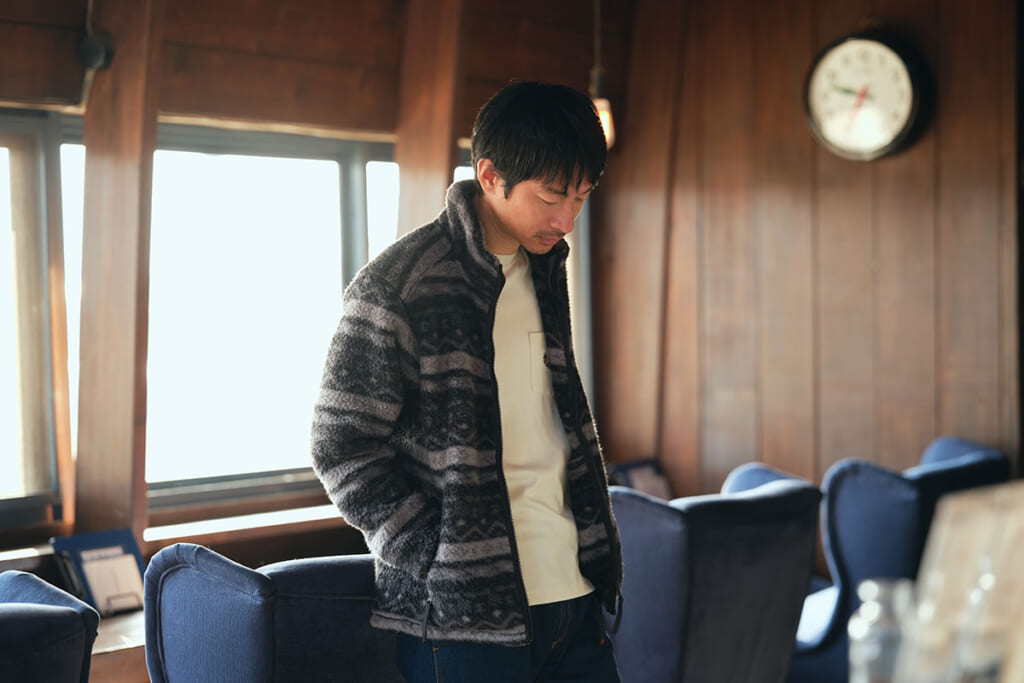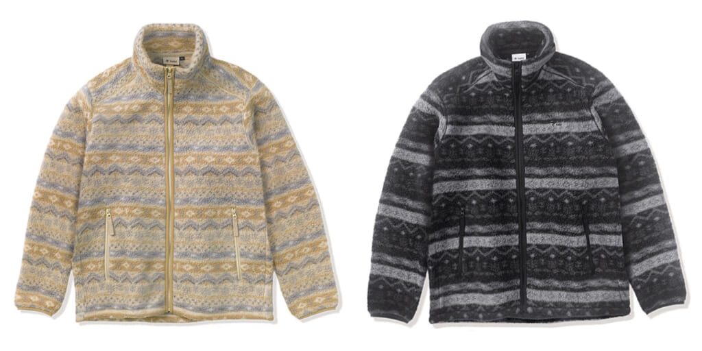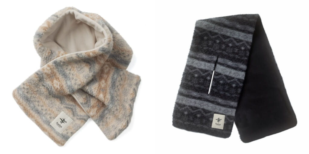 北海道の雄大な自然を大胆にアイコン化したデザインが秀逸な総柄フリースジャケットやマフラーに注目だ。