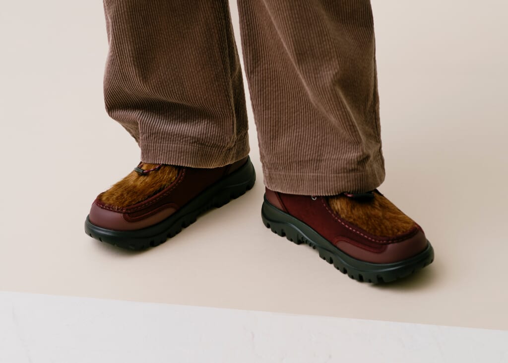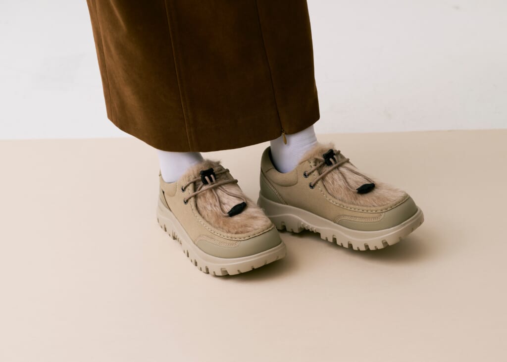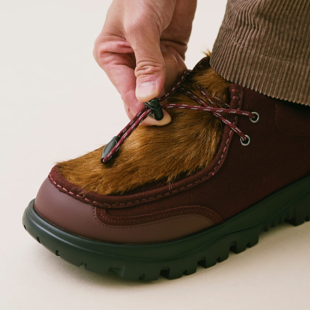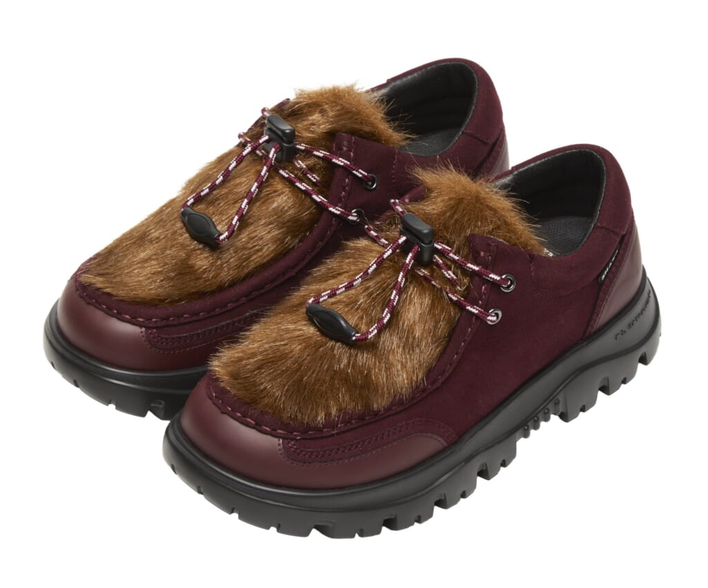 スウェード調のマイクロファイバーを用いたチロリアンシューズ“トレイルチロルモック EX”をベースとし、Uチップをなぞるように甲部分に毛足の長いファーを添えてラグジュアリーにアレンジ。見た目的にも暖かさが漂ってくる。