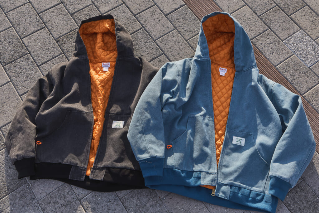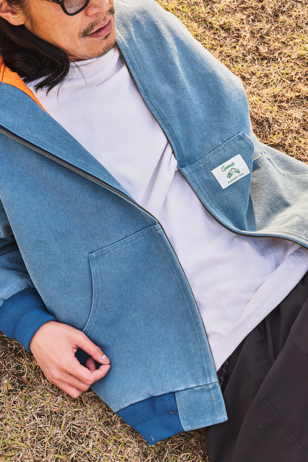 フーディスタイルのショート丈アウターは、ダック生地に洗い加工を施してフェード感を出しつつ、この素材特有のゴワつきを軽減。オレンジが眩しいキルティングの裏地は優しく身体を温め、緊急時にはMA-1の様に裏返してSOSを送ることも可能。