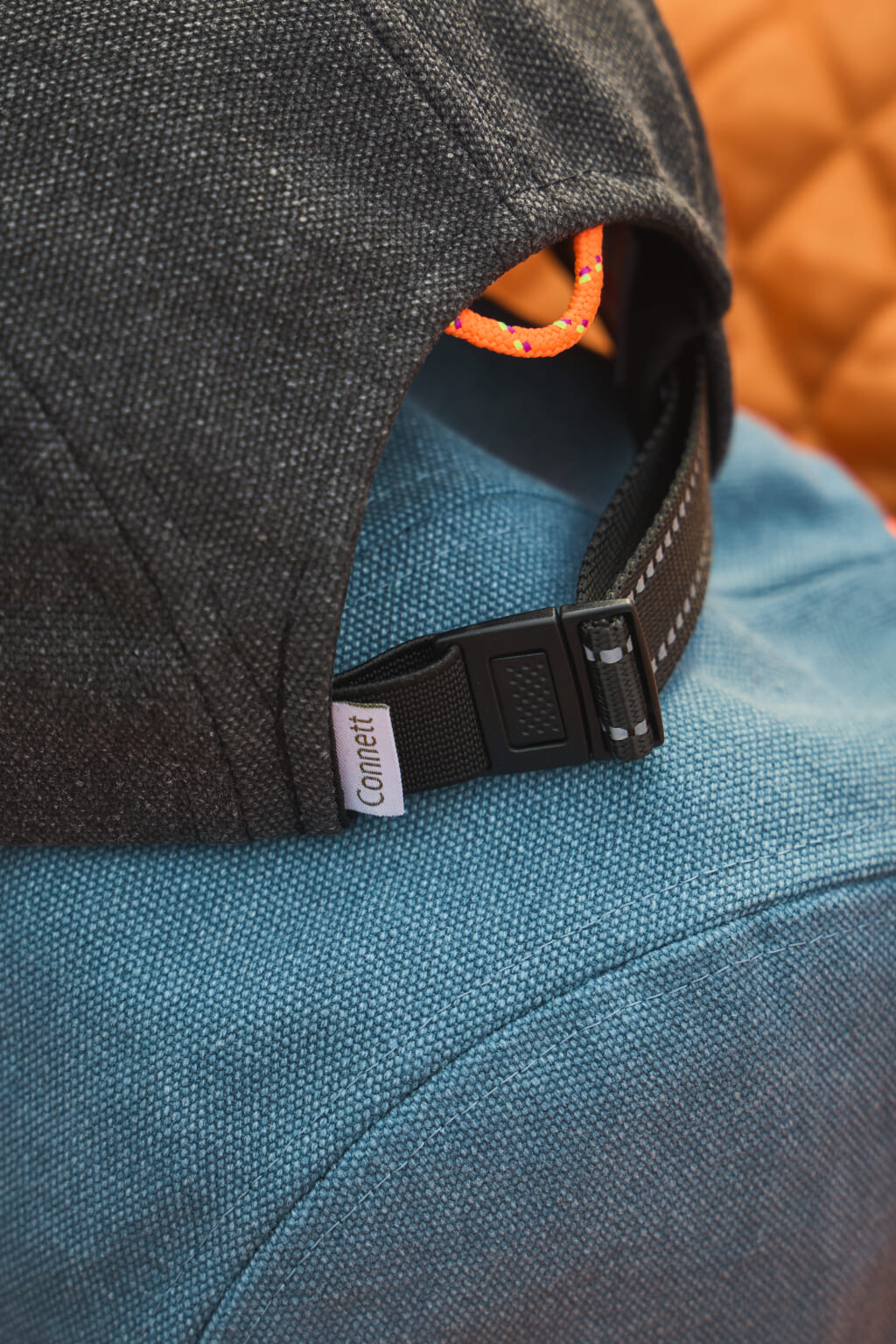 コネット定番の 4パネルキャップも、アウターと同様に洗い加工を施したダック生地を採用。アジャスターにはブランドのアイコンでもあるコードループとリフレクターラインベルトをオン。つばも「Connett」が特注した芯を採用するなど、見えない部分まで仕様にこだわり抜いた。