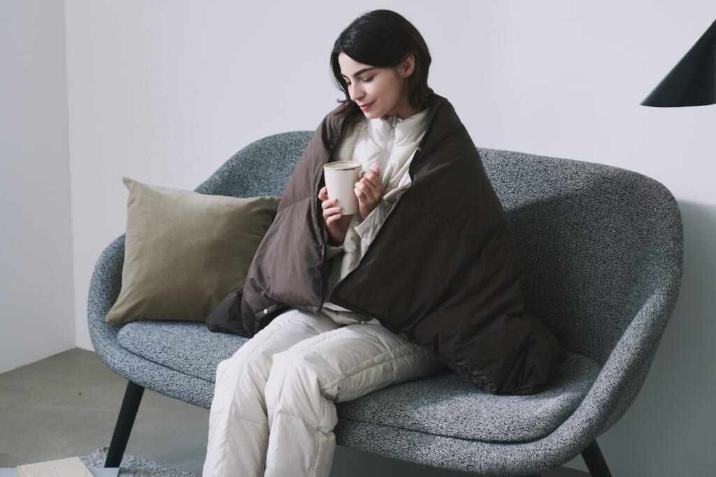 布団やポンチョ、カーディガンと3通りの使用方法があるので、ソファやベッドサイドに置いておくと何かと便利なハイブリッドモデル。保温性に優れた800FPダウンを使用しているので、保温性も言わずもがなバツグンです。使用しない時は折りたたんで、クッションとしても利用できます。