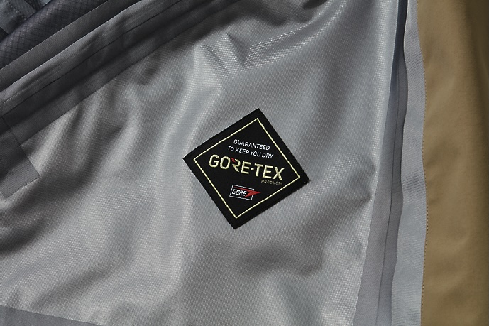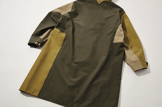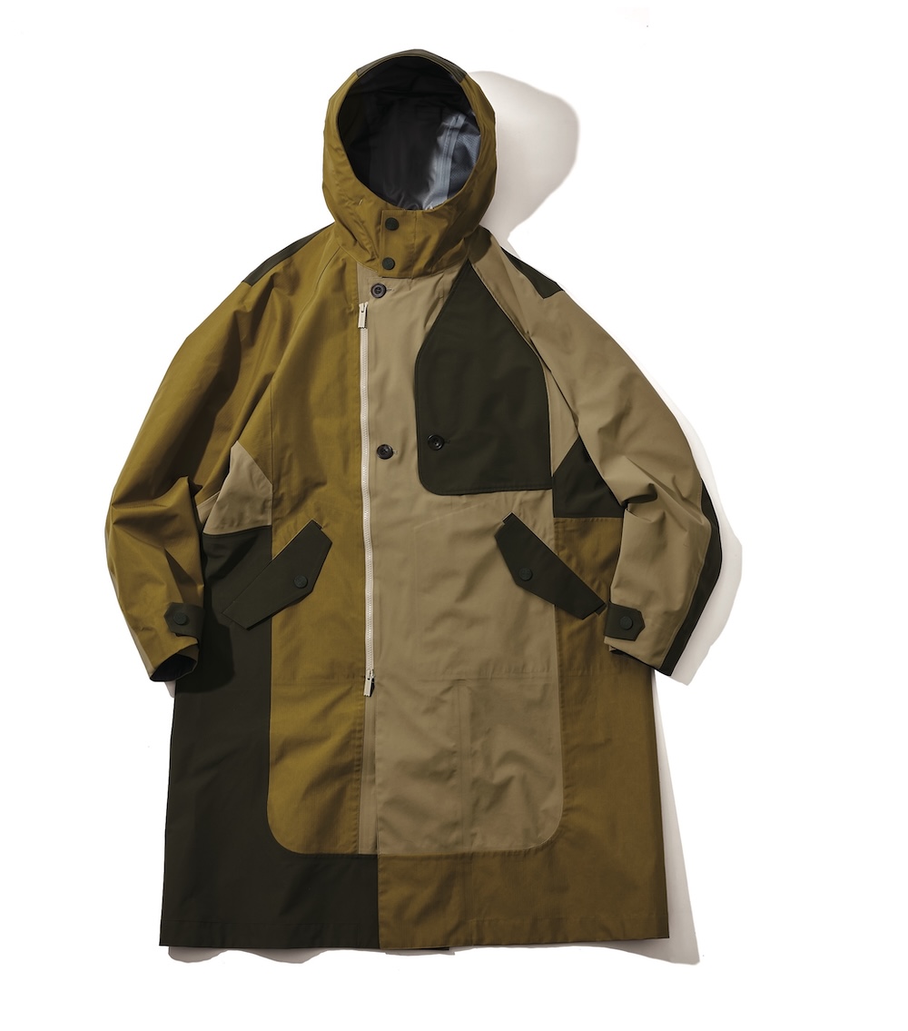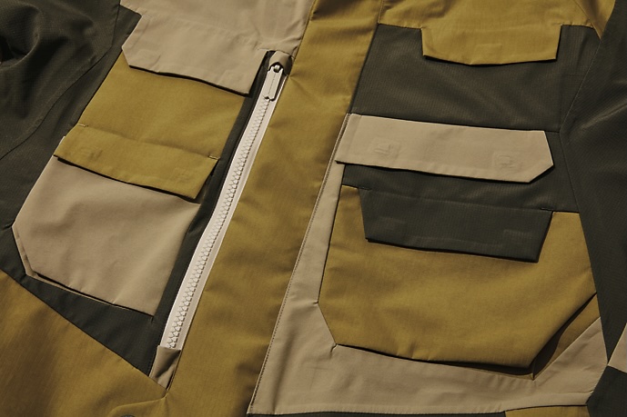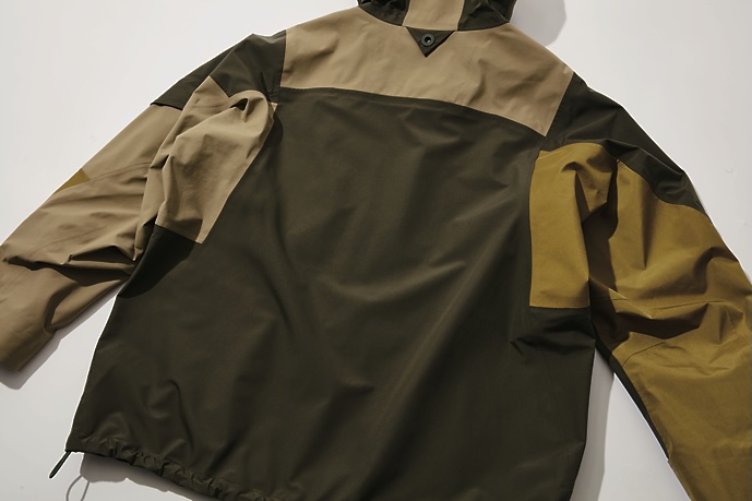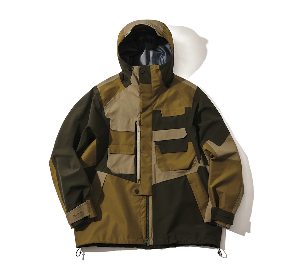 3色のゴアテックス素材をバランスよく落とし込んだマルチカラーデザインが特徴で、表地にはリサイクルナイロンを、裏地にはソリューションダイで染色した素材を使用した3レイヤー仕様。アシンメトリーに配置されたポケットもいいカンジ。