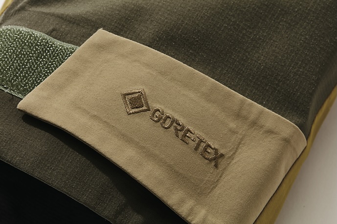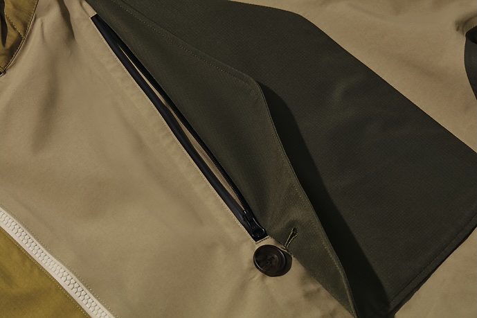 ジャケットと同様、防水性、防風性、透湿性に優れたゴアテックス3レイヤーを採用したマルチカラーデザインで、革新的なePEメンブレンを使用。左胸にはトラッドな印象のあるガンフラップを備え、オーバーサイズのAラインシルエットに。