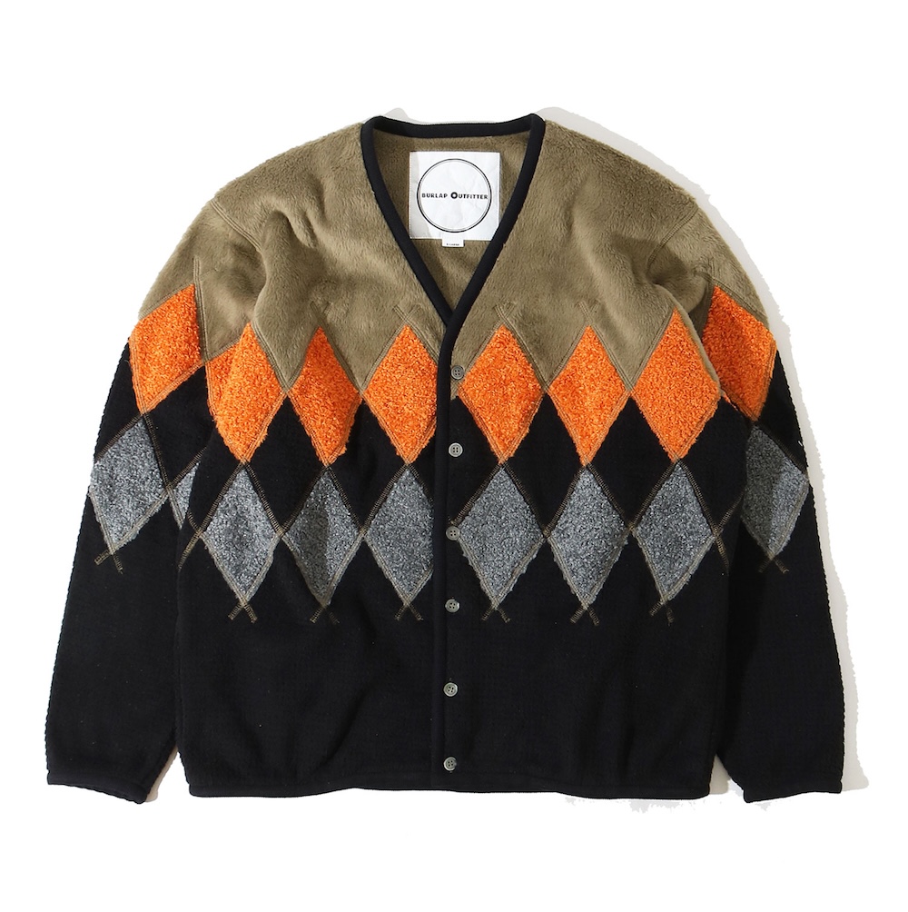 USミリタリーサープラスのフリースをふんだんに使用したカーディガン。フラットシームで、手のかかるパッチワーク技術をあえて採用し、細やかなアーガイル柄を表現しています。ゆったりとしたシルエットなので、スウェットやフーディの上からサッと羽織るのが良さそうです。