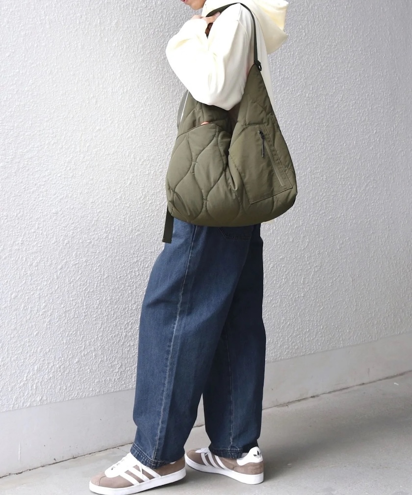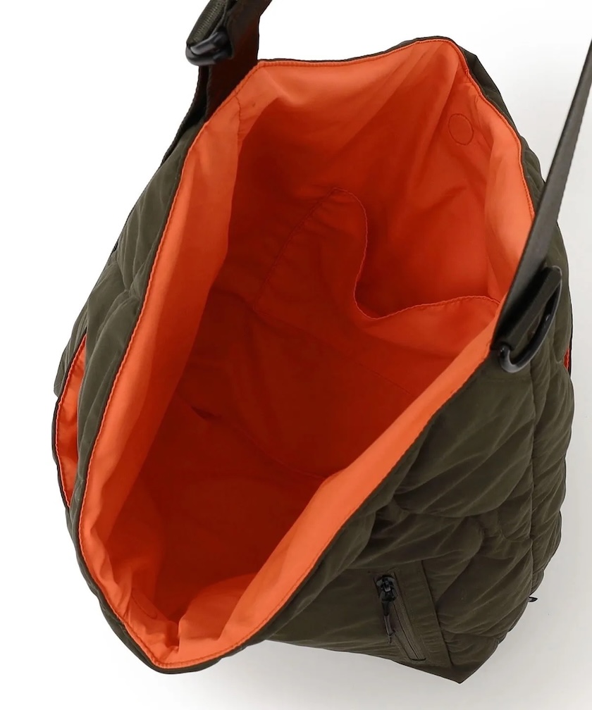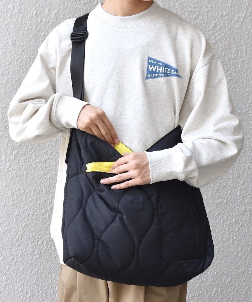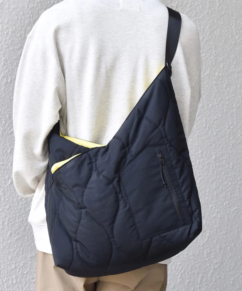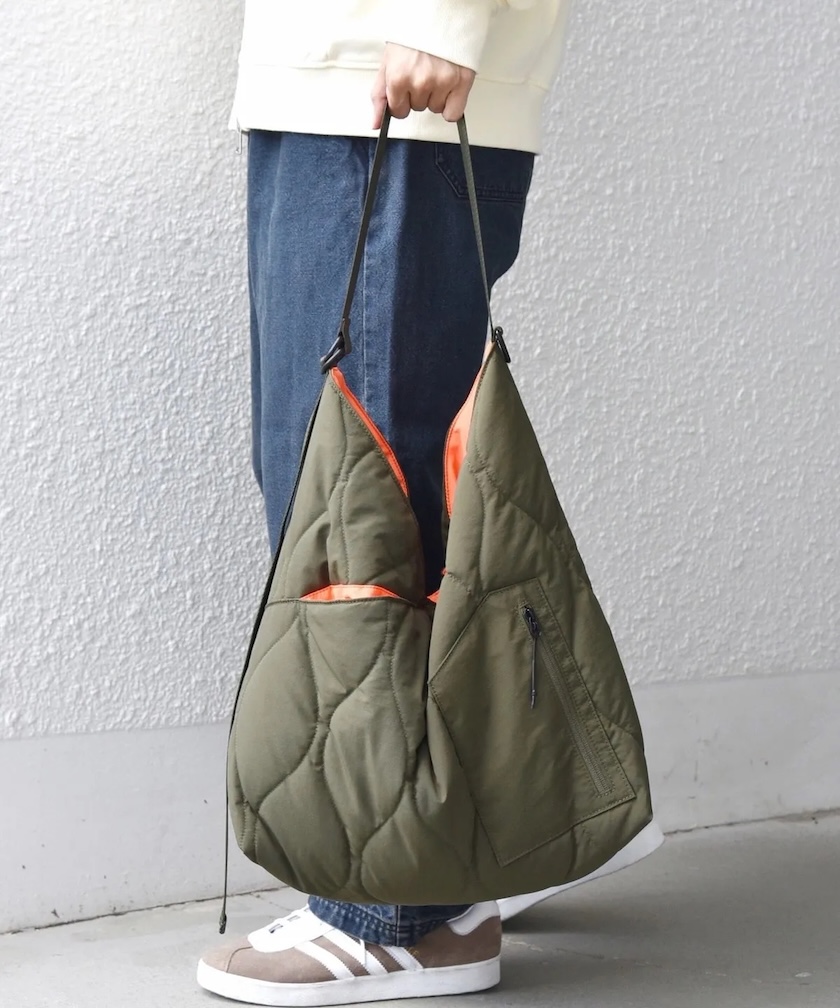 風呂敷を縫い合わせた日本古来のアズマバッグがイメージソース。中綿を封入したミリタリーキルトを表地に使用し、ふっくらとしたフォルムとさり気なく無骨な雰囲気に。着こなしのアクセントになるデザインを落とし込み、伝統的なバッグを独創的にモダナイズ。