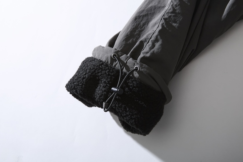 滑らかで撥水性のあるナイロンと、脚を暖かく包み込む毛足の長いボアを表裏で使用。着用した瞬間から快適性を感じさせる一本を、GO OUTとのコラボで表地をグレー、裏地をブラックにカラー別注。さり気なくも大胆なアレンジがポイントです。