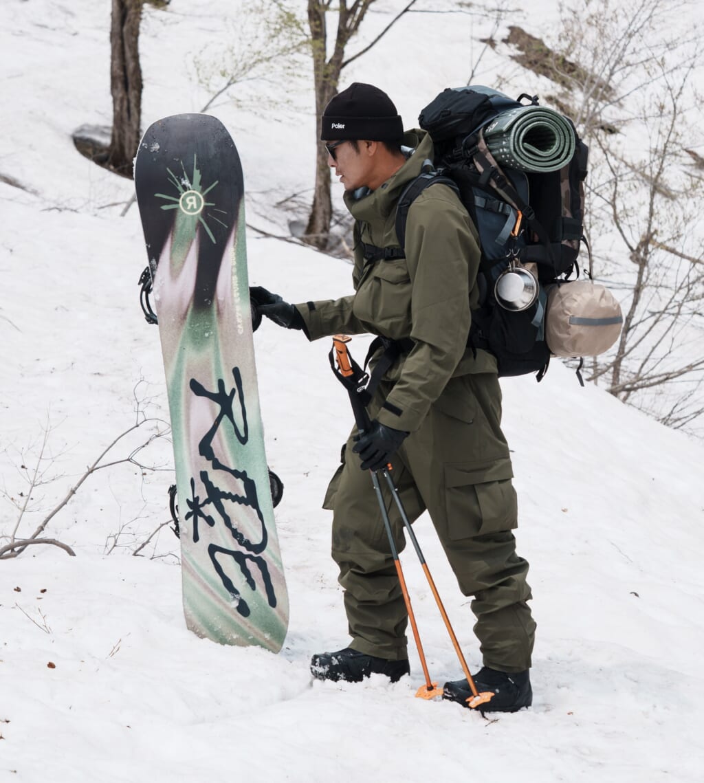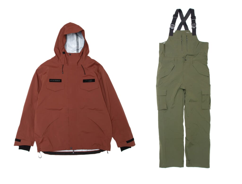 前回のコラボで好評だったM65フィールドジャケットベースのスノージャケットと、これにフィットするビブパンツ。耐水圧と透湿性に優れるストームプルーフ生地を採用し、パスホルダーやパウダーガードなどスノーボーダーのリアルな声を反映している。