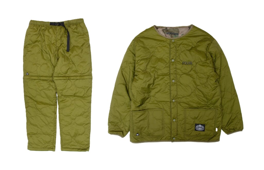 繊維の中心空洞で綿より軽く、空気層を創り出すことで保温性にも優れるサーモライトを使ったキルティングのセットアップ。トップスはリバーシブル仕様でソリッドカラーとカモフラ柄を切り替え可。パンツはファスナーでショート丈にもできる2WAYとなっている。