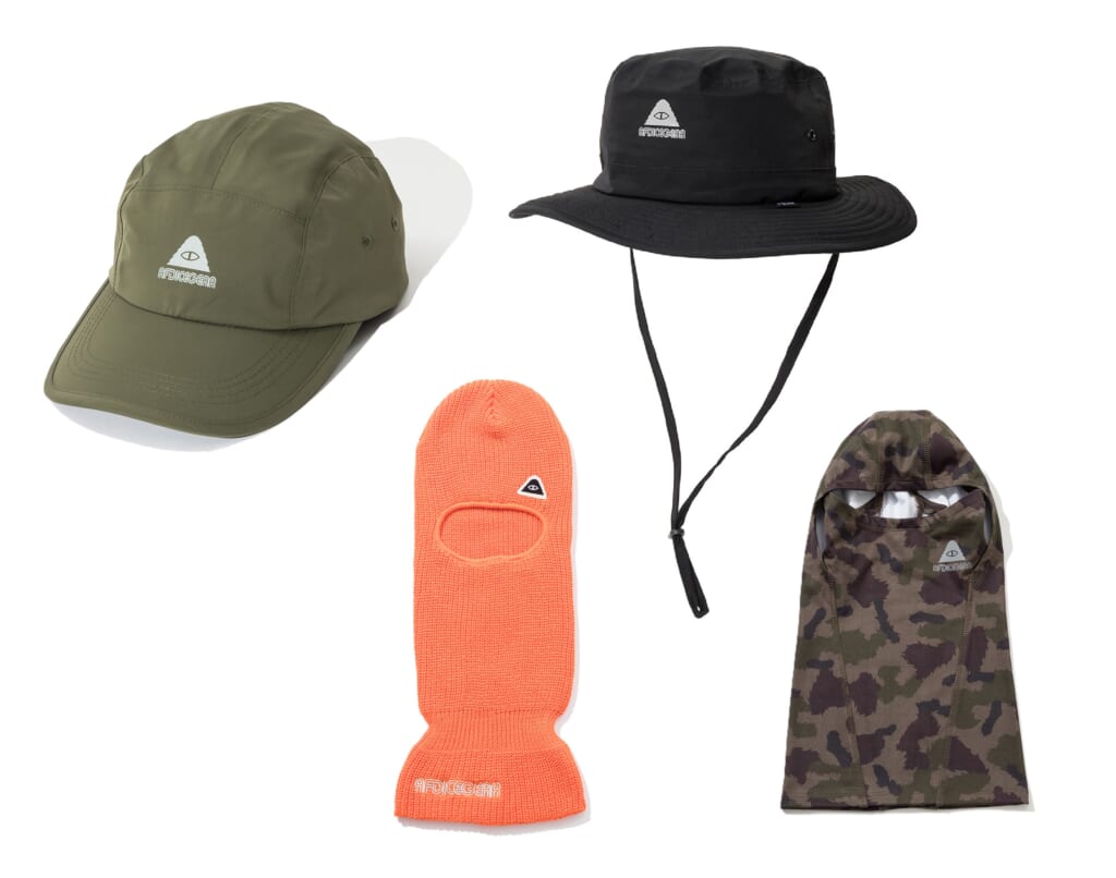 ストームプルーフ素材のキャップやハットは撥水性と透湿性を兼ね備えているからスノーアクティビティからアウトドアユースまで幅広く活躍! 両ブランドのロゴがあしらわれている。