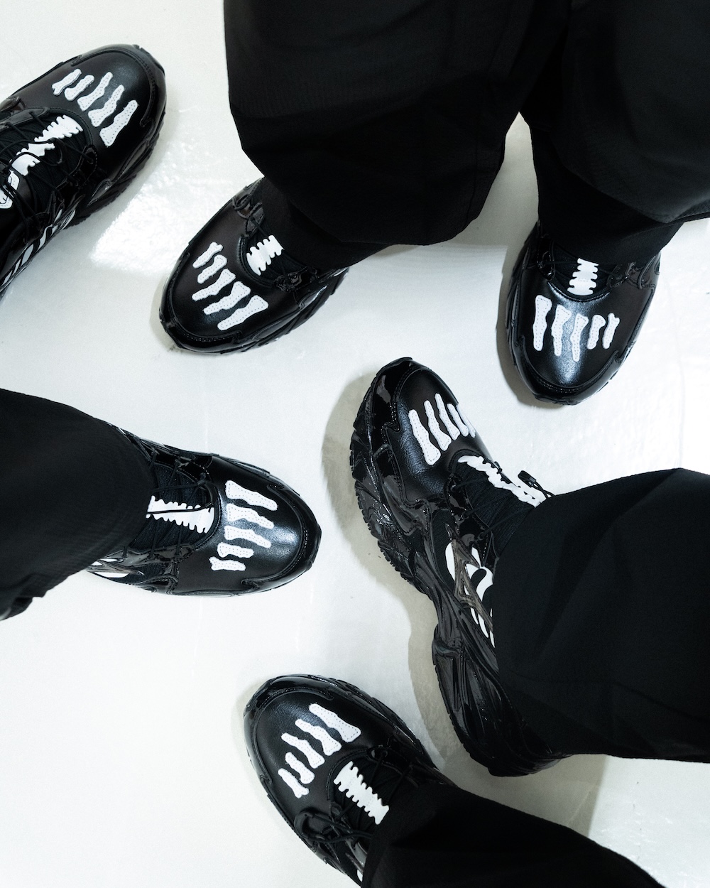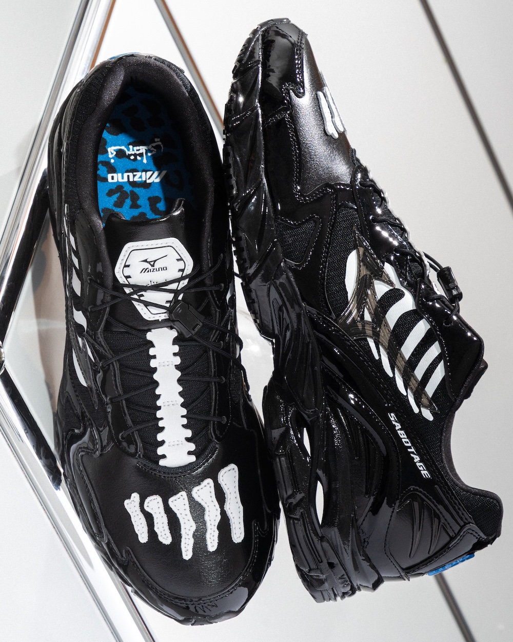こちらのモデルは、80年代後半から90年代初頭のパンクやスケートカルチャーから着想を得て、サボタージュのシグネチャーデザインである“Bones”を追加。そこに「ミズノ」が得意とするテッキーなエッセンスを注入して、ハイブリッドな仕上がりに。