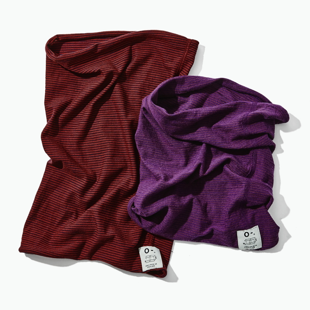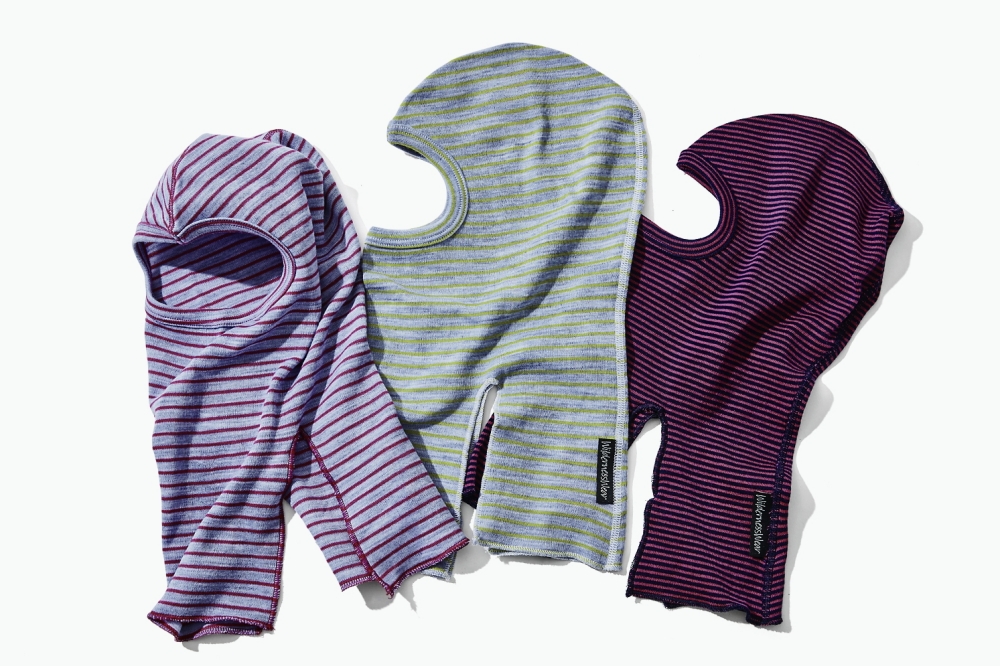 メリノウール100%の天竺編み地を使用した、首から鼻まで覆えるネックウォーマー。鼻まで覆っても呼吸がしやすい薄さがミソ。上部を結びニット帽にしても。各¥6600