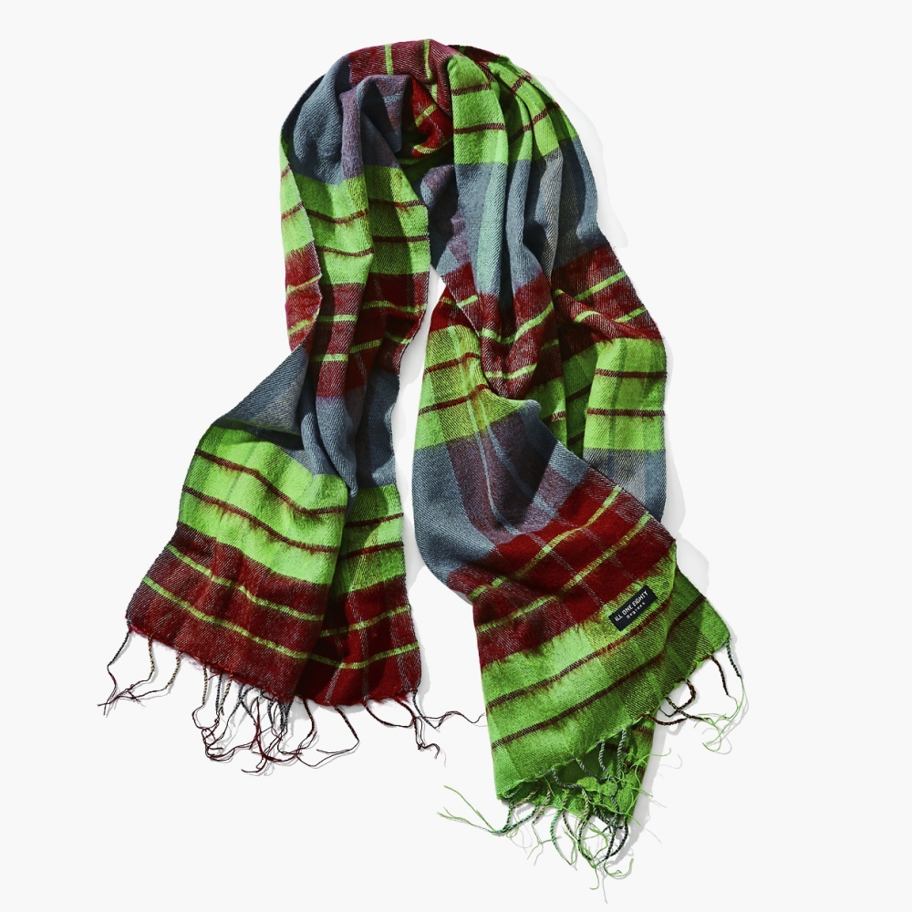 裏表で色が反転する袋ジャカードで編み上げてあるため、無造作に巻けば奥行きのある表情を演出できる。メリノウールのしっとりとやわらかな質感も特徴。¥28600