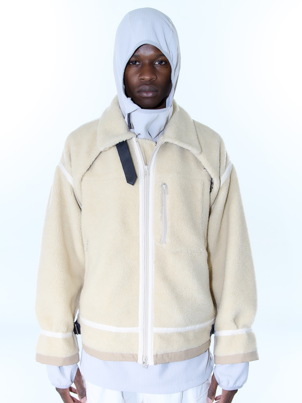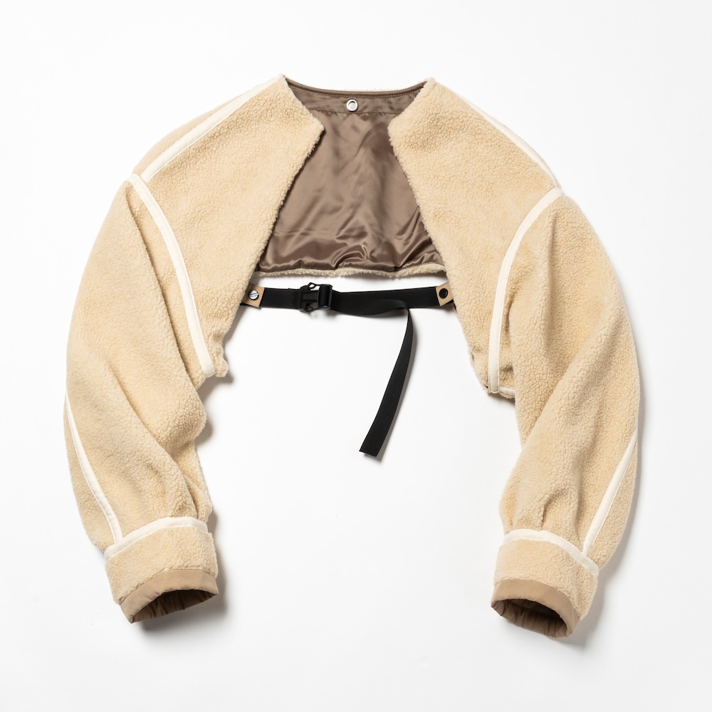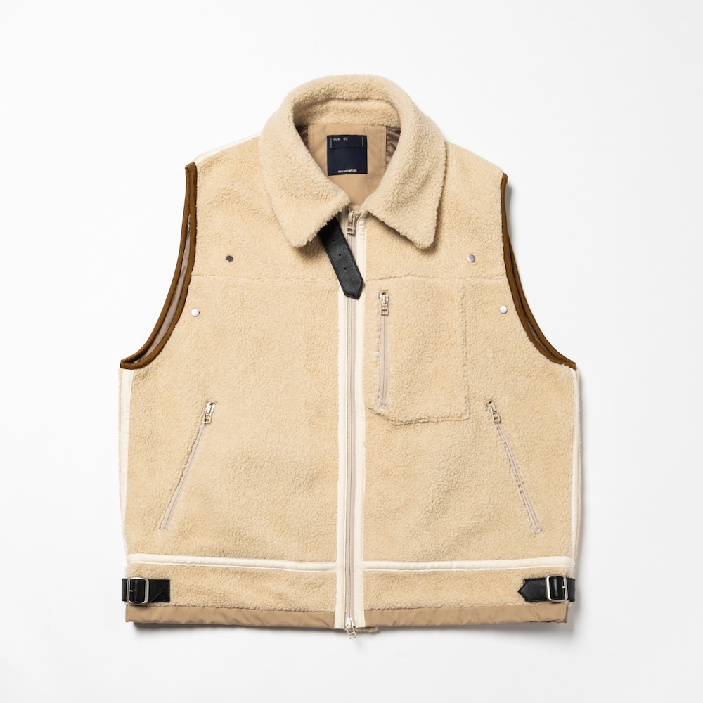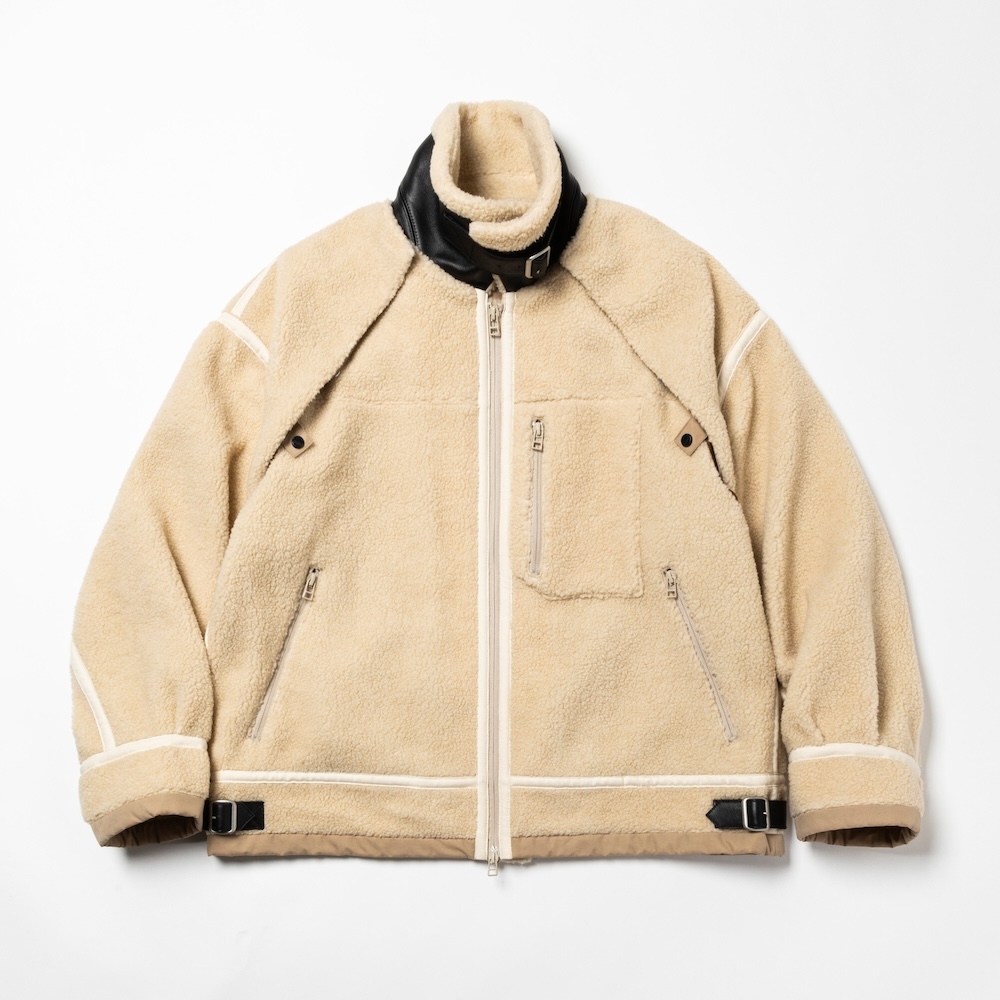 毛足の長いフリースを使用したB-3ジャケットは、ラグランタイプのデタッチャブル式スリーブを採用し、ジャケットの状態ではオーバーサイズなシルエットに。ベストの状態では肩の落ちていないスタンダードなサイズ感で、着用時の印象に変化を持たせています。