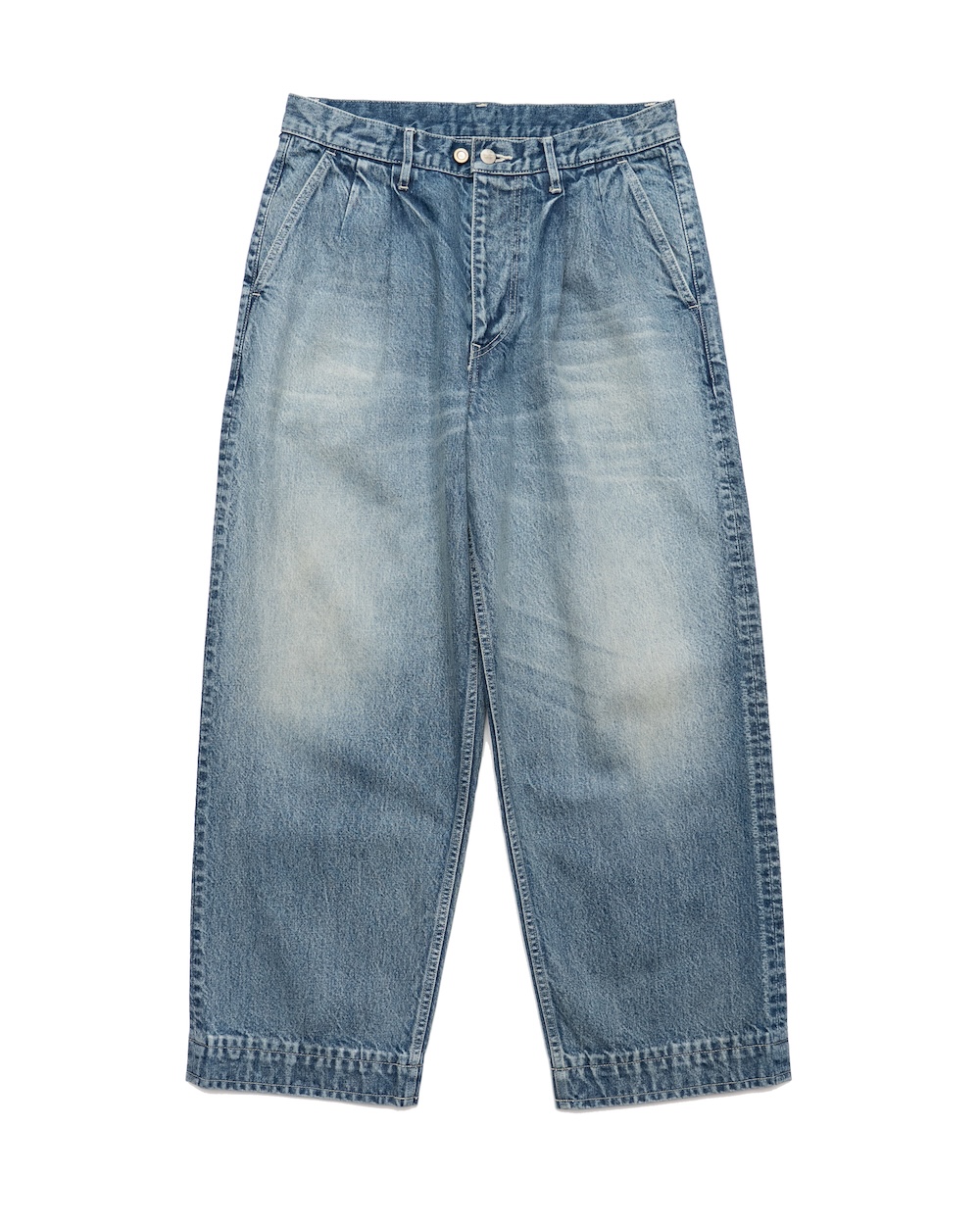 こちらのモデルは、「グラフペーパー」のタック入りデニムパンツを軸に、「N.ハリウッド」で使用されている13ozデニムを用いたアップデート版。ヴィンテージ加工を施すことで、古着のような風合いを演出。