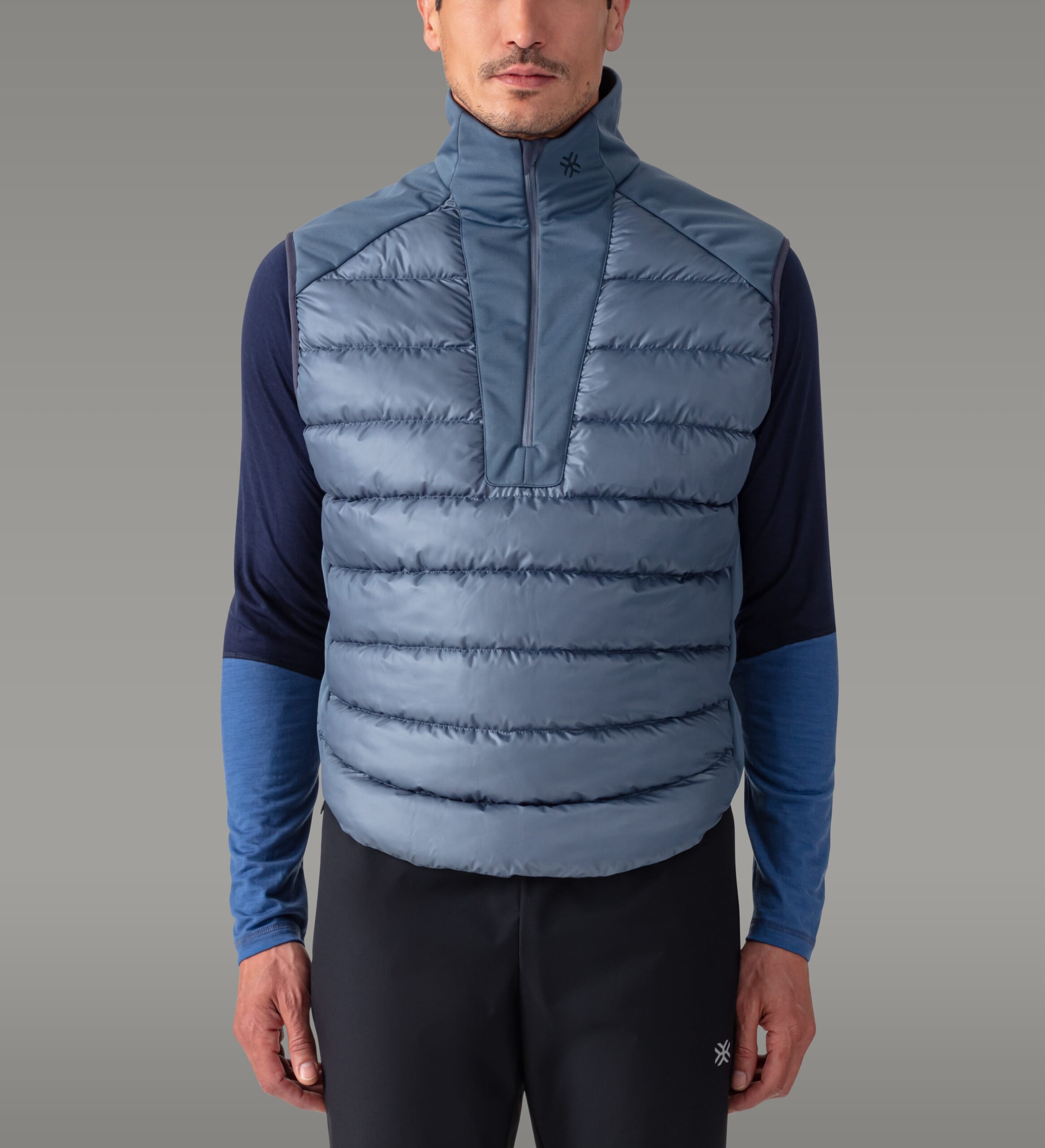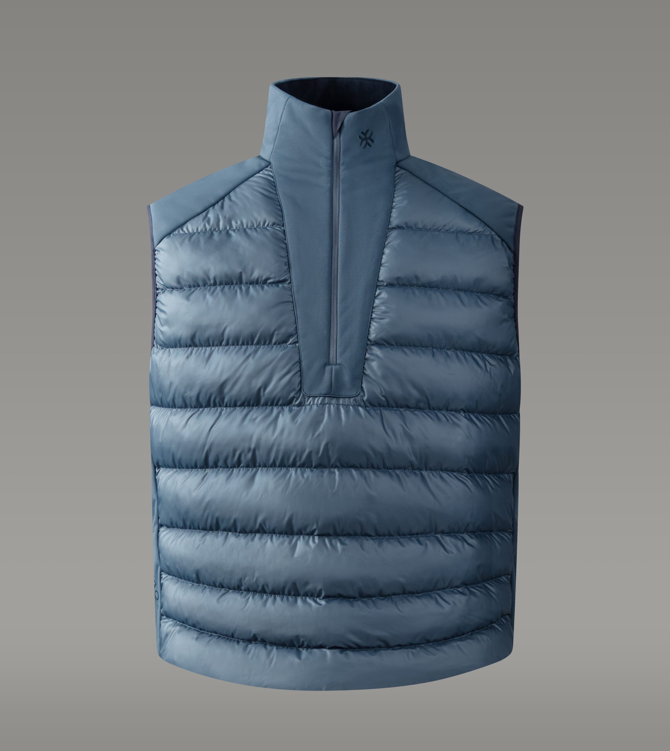 スイスアルプスの氷河から命名された“FORNO”はノースリーブ=ベストタイプだ。ハーフジップのパッカブル仕様とし、スタンドカラーで首元をしっかりガードしながらショート丈でハードシェルの下に着てもかさばらない。重量は約380gとなっている。