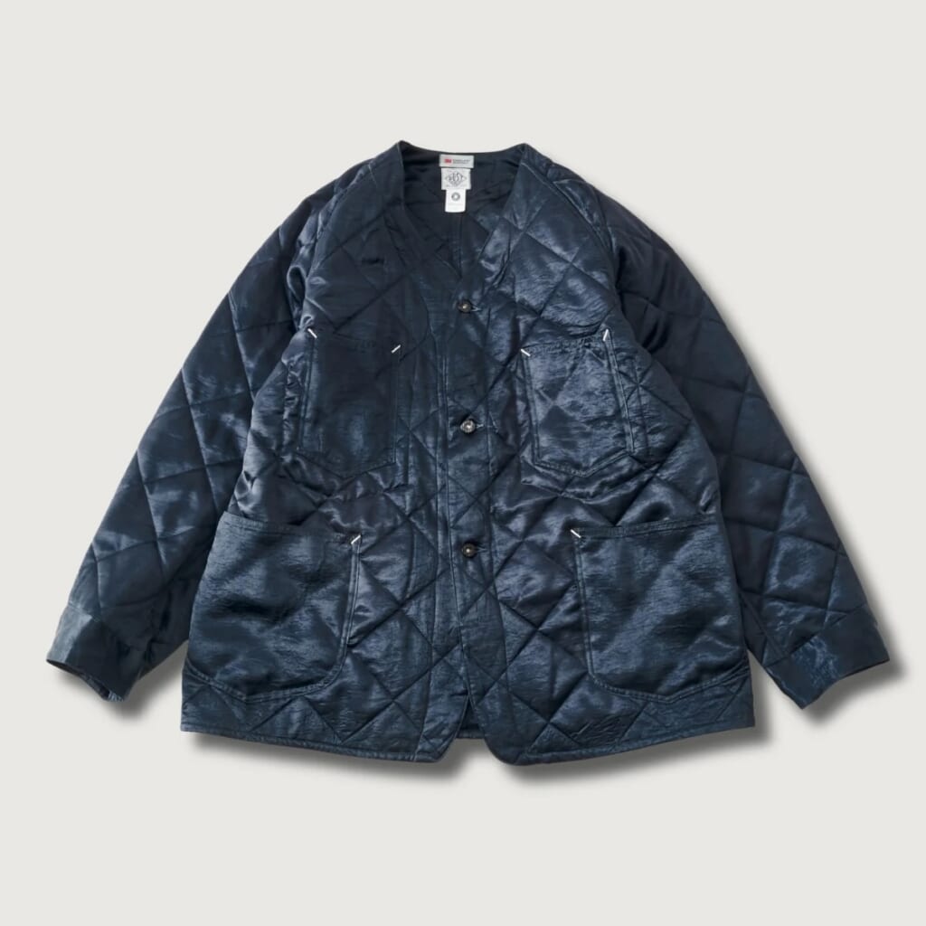 ラグランスリーブのボディに、襟はノーカラー仕様のネックデザイン、そして4つのアウトポケットと2つの内ポケットが配置されています。キルティング仕様の素材には、アセテートサテンと呼ばれる光沢感としっとりとした柔らかさを兼ね備えたものを使用。中綿には、薄くて暖かい断熱素材の3Mの高機能素材が使用されています。