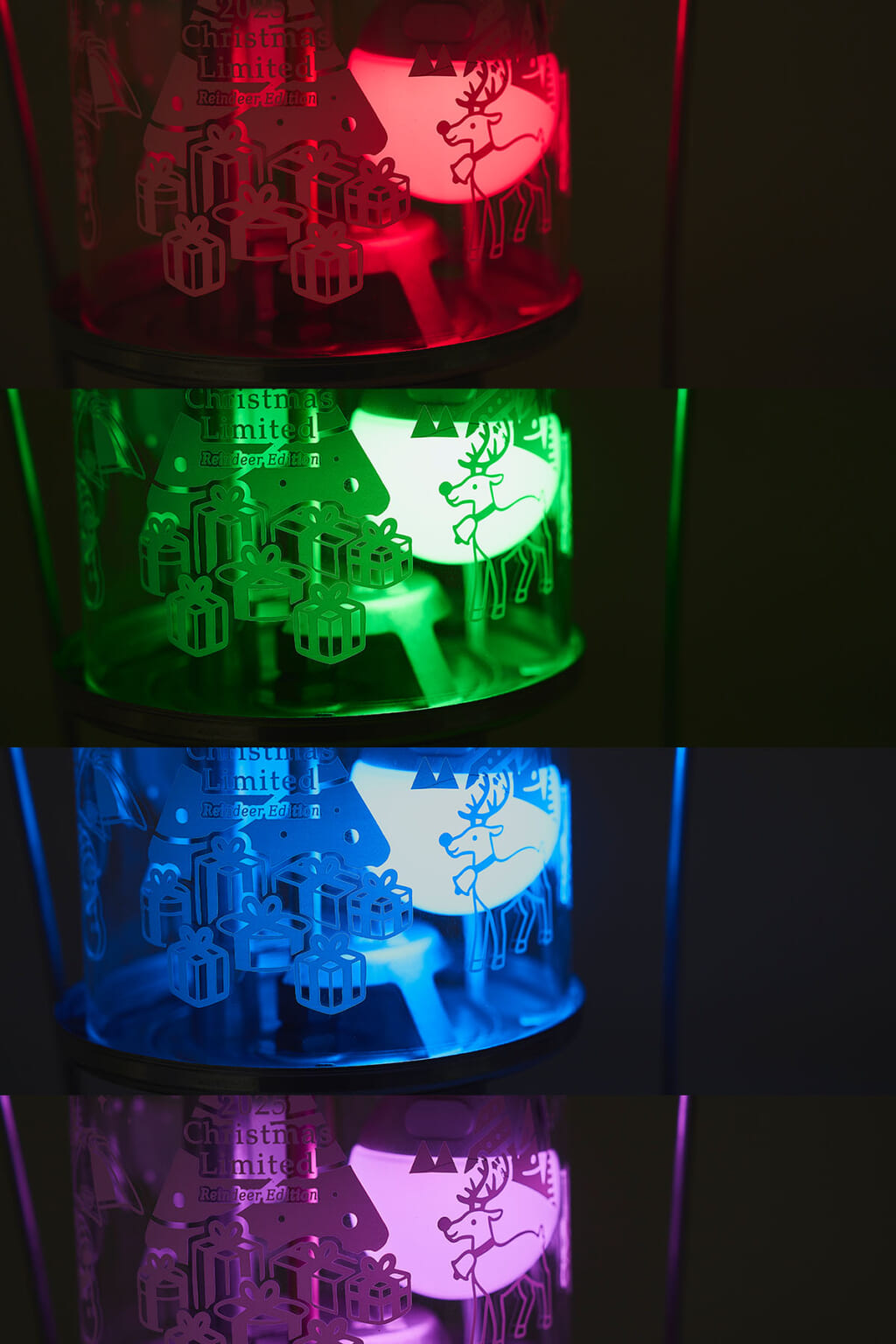 デザインはクリスマス限定の「サンタクロースエディション」と「トナカイエディション」の2種類。サンタクロースがキャンプ場にプレゼントを届けている様子や、雪だるまとトナカイが贈り物を囲んでいる楽しげな姿が、灯りとともにふんわりと浮かび上がります。