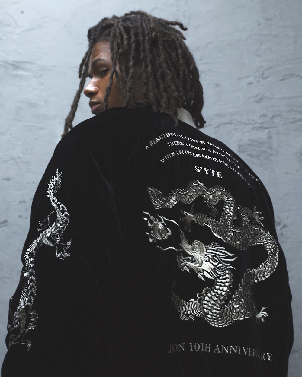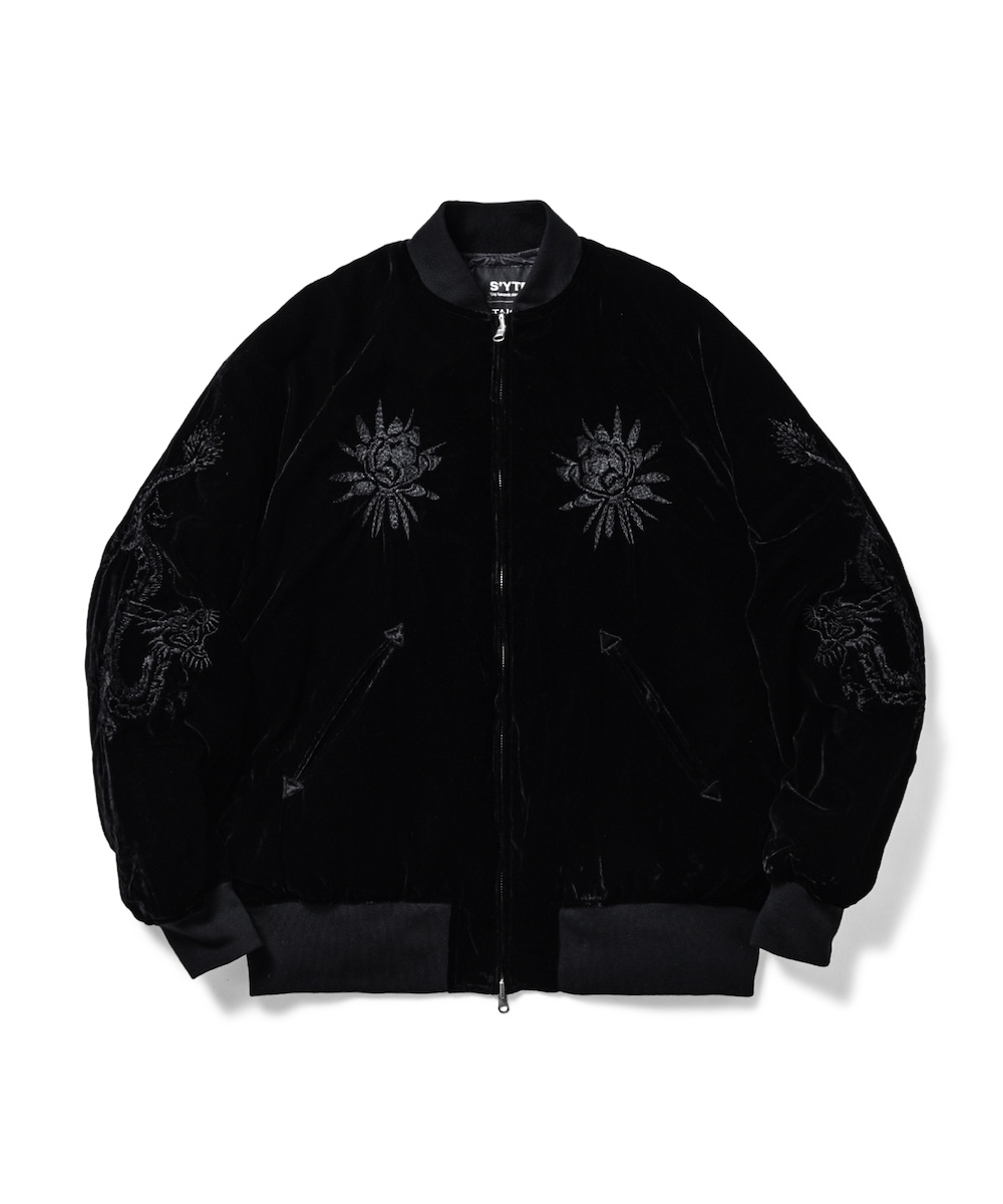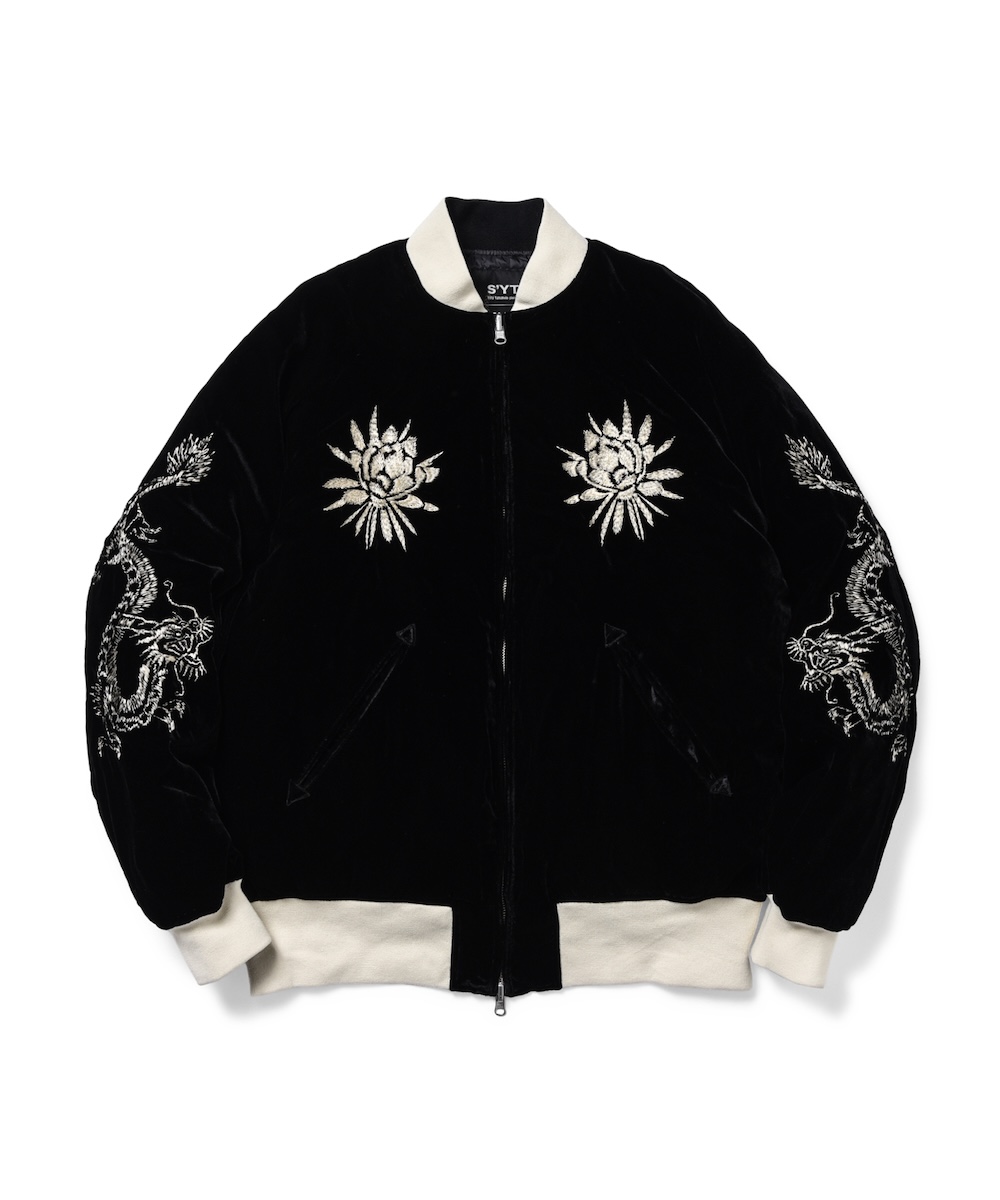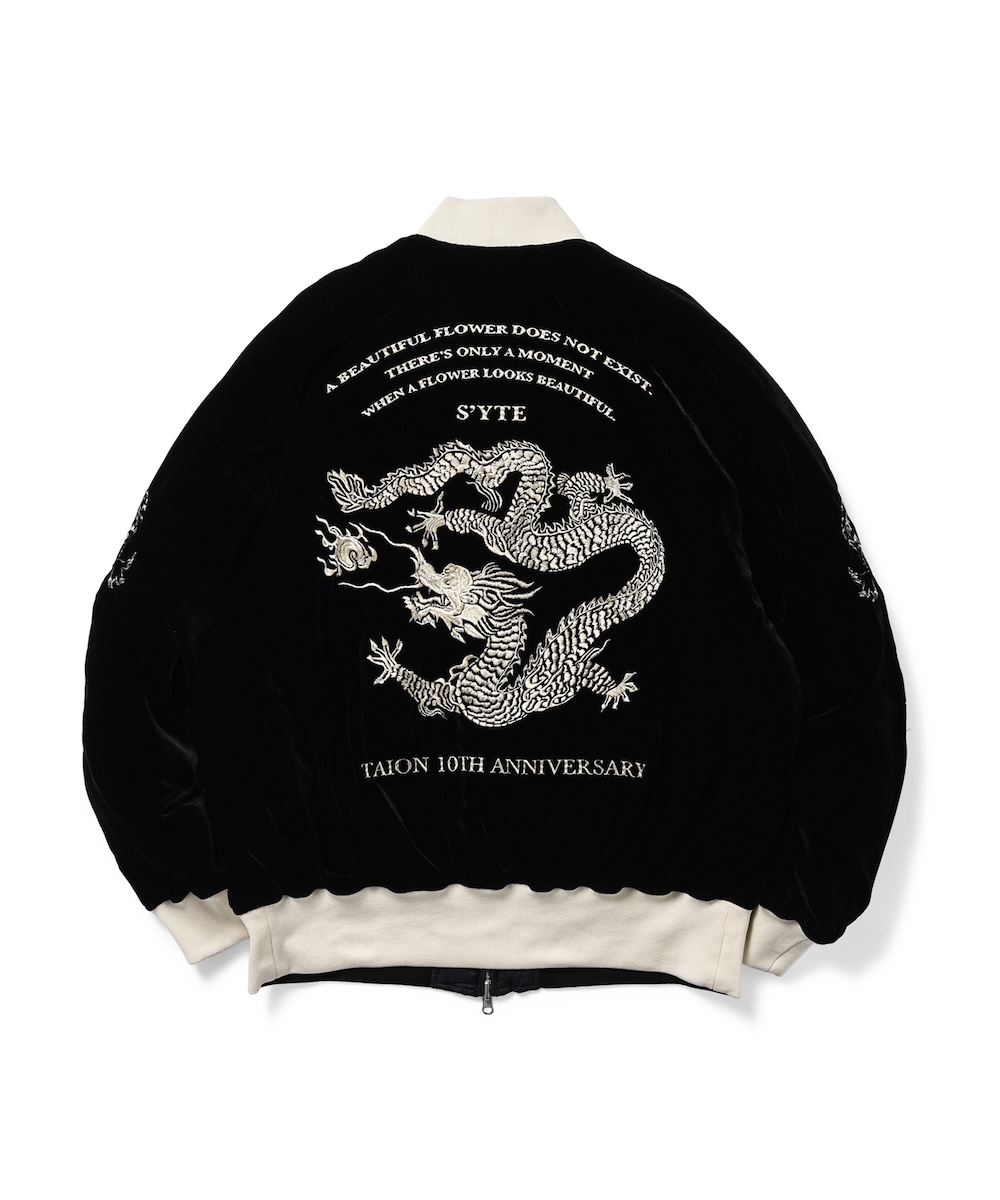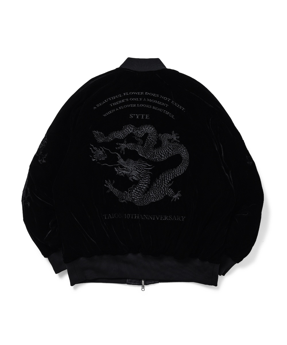表側には毛足のある上質なベロア素材を使用し、特有の光沢と陰影が立体的な美しさを演出。前後袖には「サイト」を象徴する花と龍の刺繍が配置されています。また、背面には“TAION 10TH ANNIVERSARY”の刺繍が施され、メモリアルに相応しいデザインに仕上がっています。